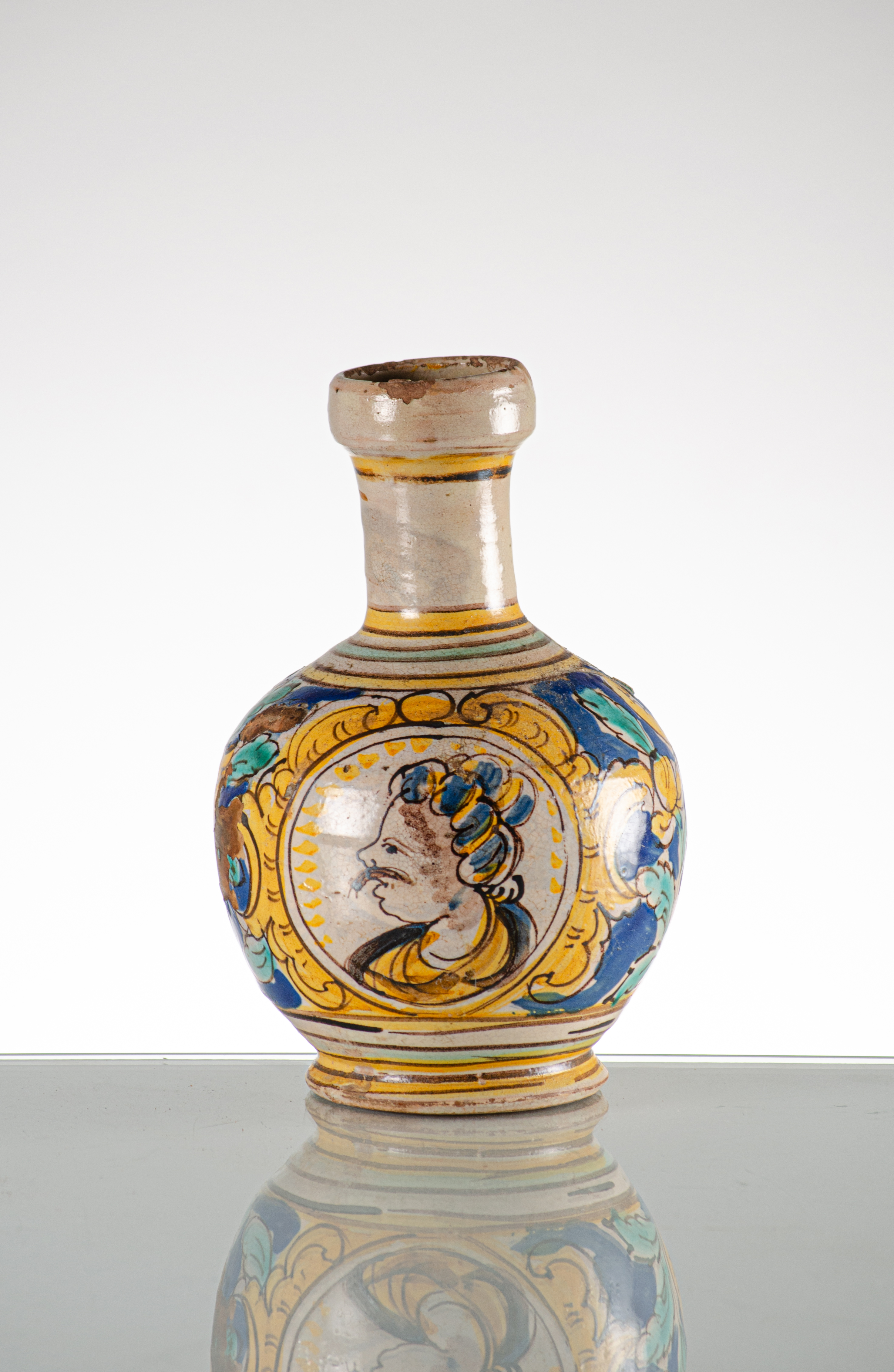 Bottiglia in maiolica smaltata e decorata con medaglione centrale raffigurante "Profilo maschile" (difetti e mancanze).