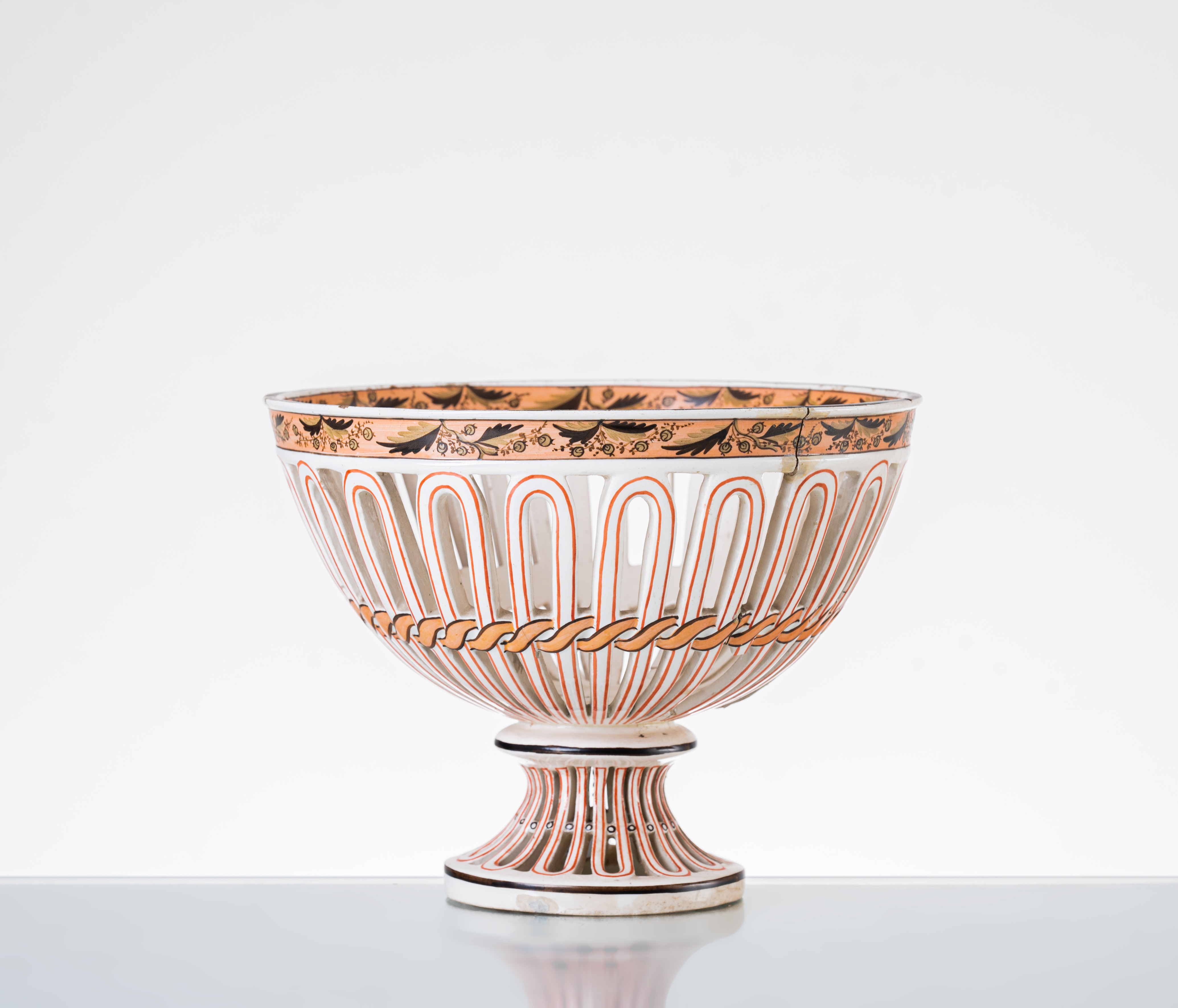 Centrotavola in ceramica decorata e smaltata nei toni del bianco e rosa (rotture e mancanze).