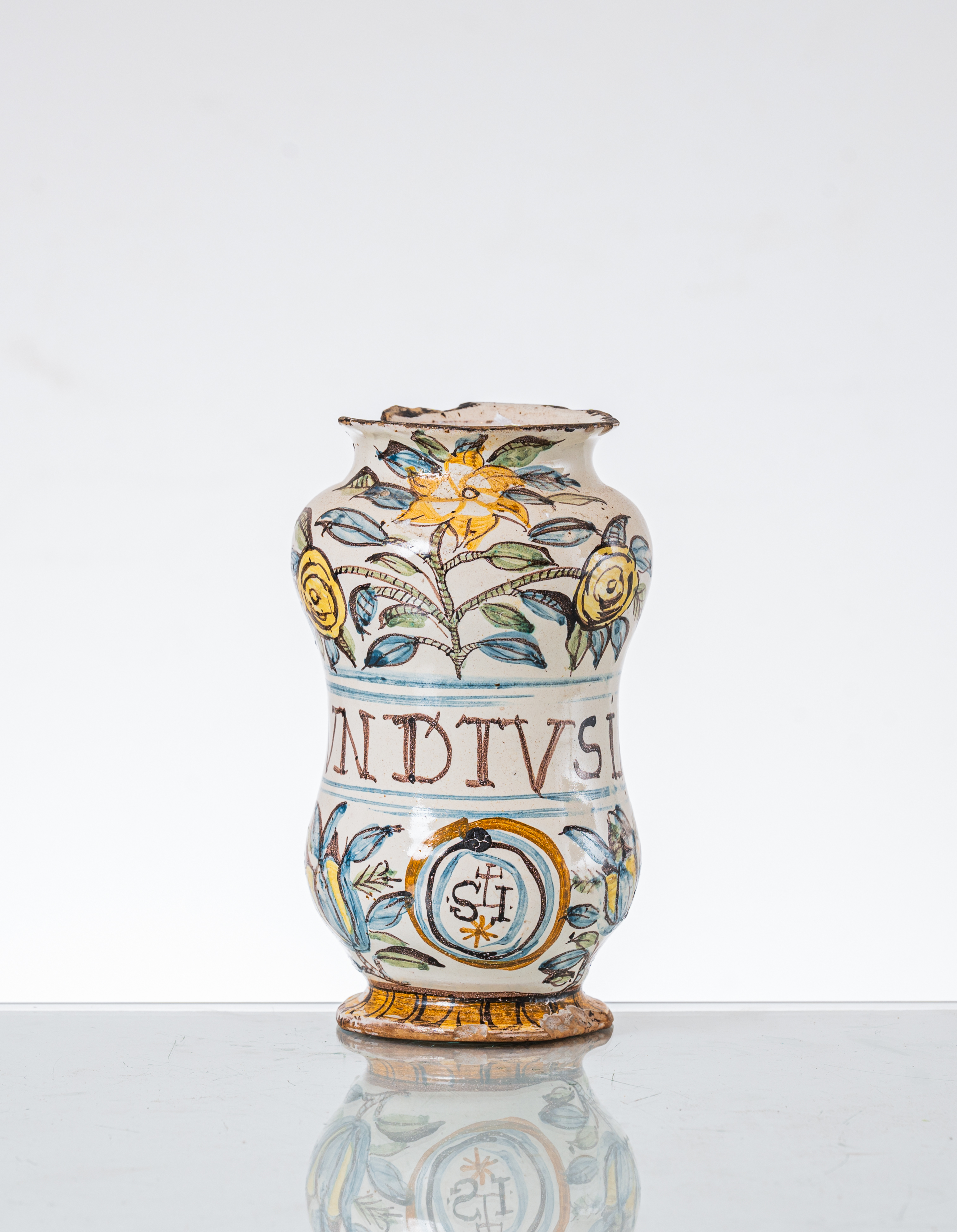 Albarello da farmacia in ceramica smaltata e decorata (mancanze e difetti).