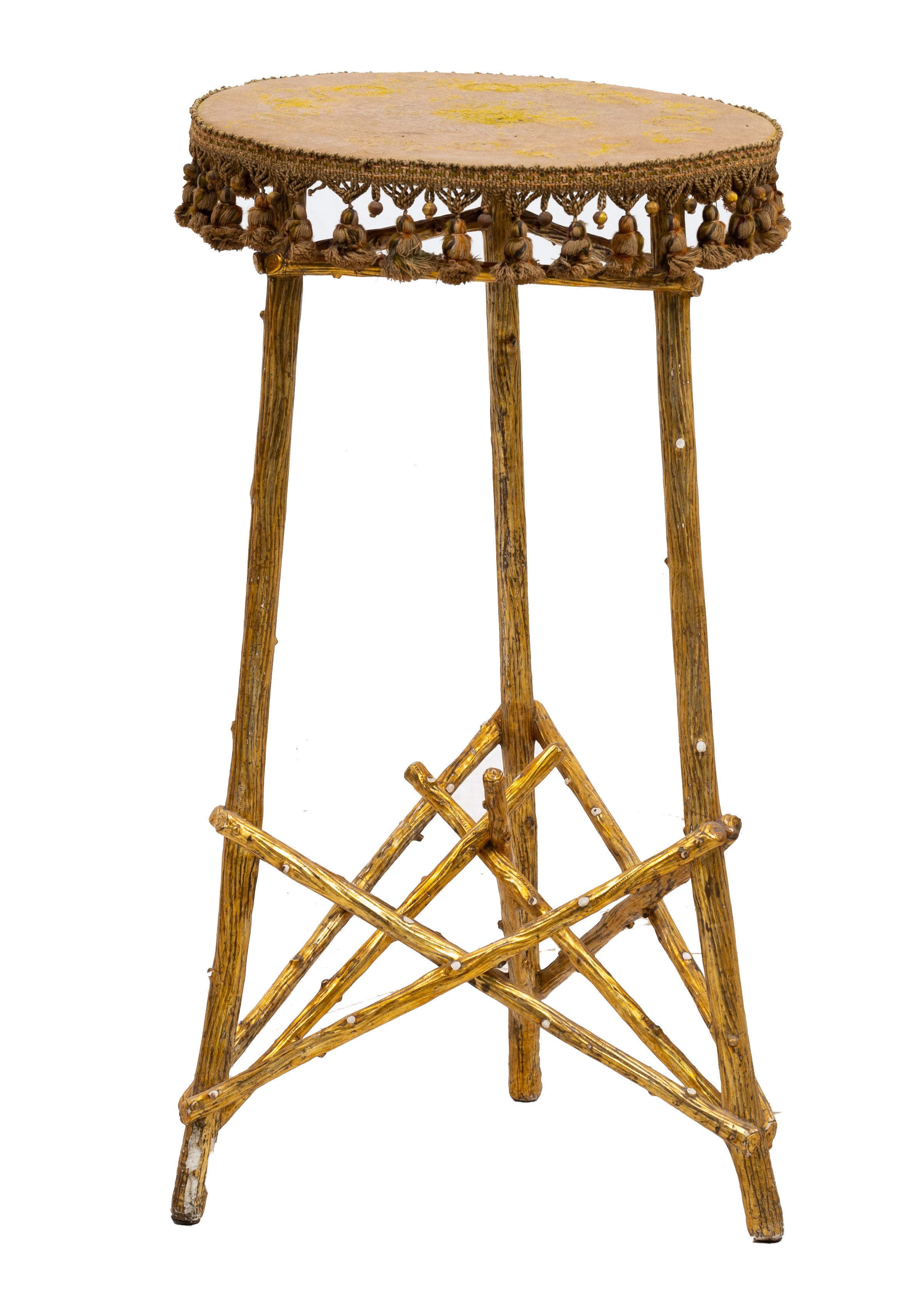 Tavolino di gusto eclettico in legno dorato ad oro zecchino, piano in tessuto.