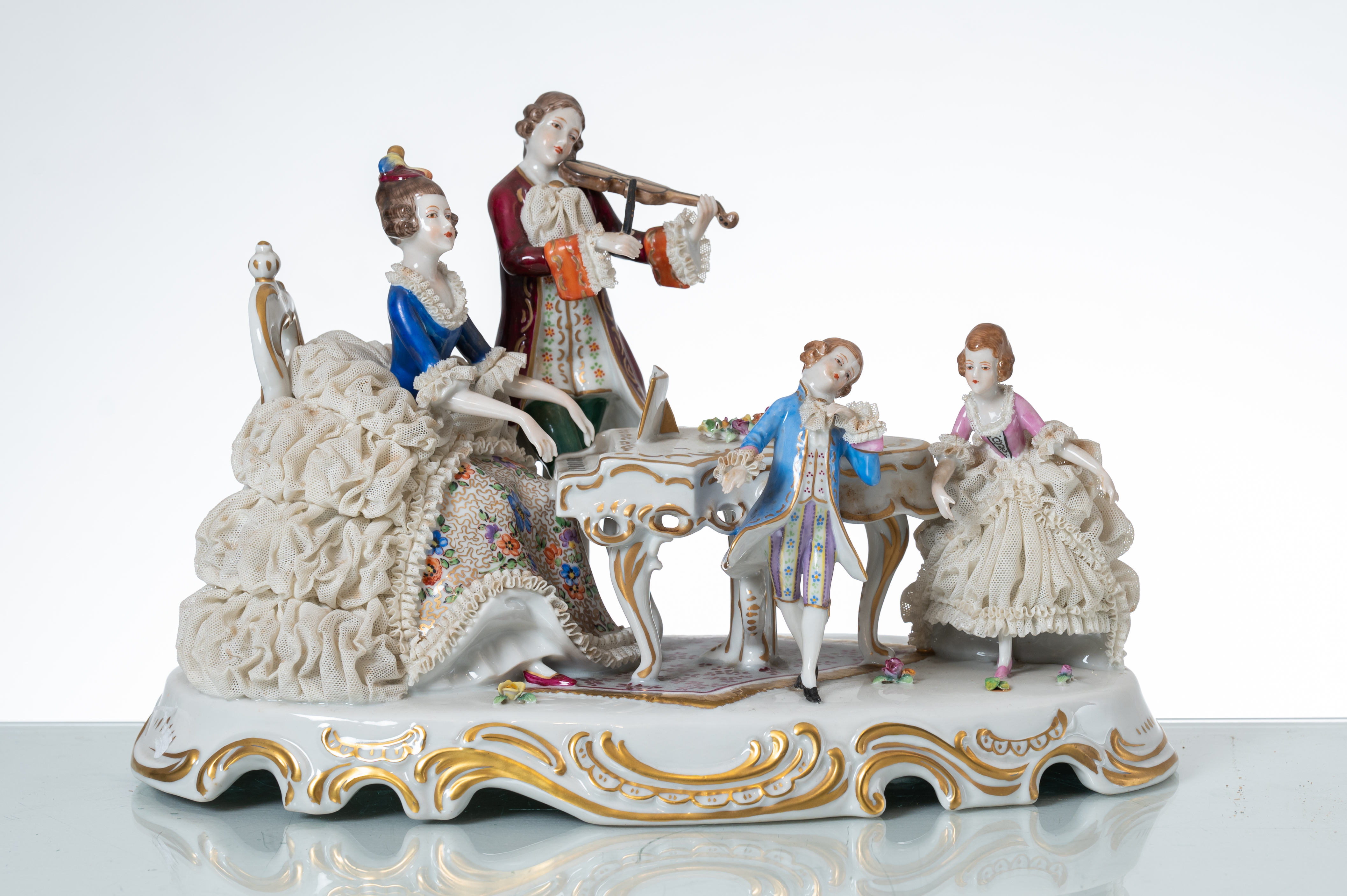 Gruppo in porcellana raffigurante "Figure nobiliari con pianoforte" decorata con lumeggiature in oro (mancanze).