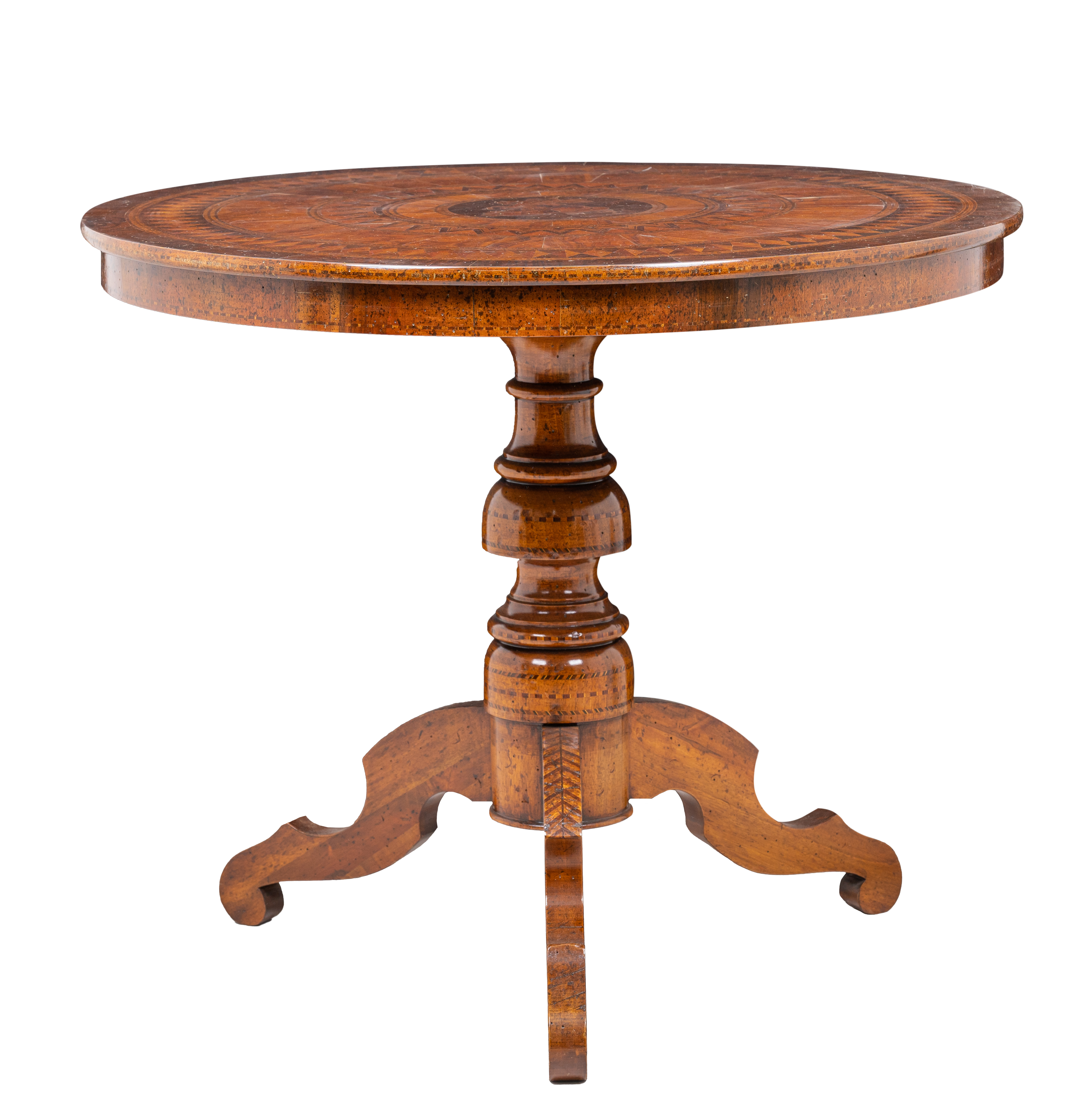Tavolo da centro a vela, di forma circolare in legno di noce, di gusto sorrentino, riccamente intarsiato in varie essenze di legno a disegno geometrico, decoro al centro raffigurante "San Giorgio che uccide il drago".