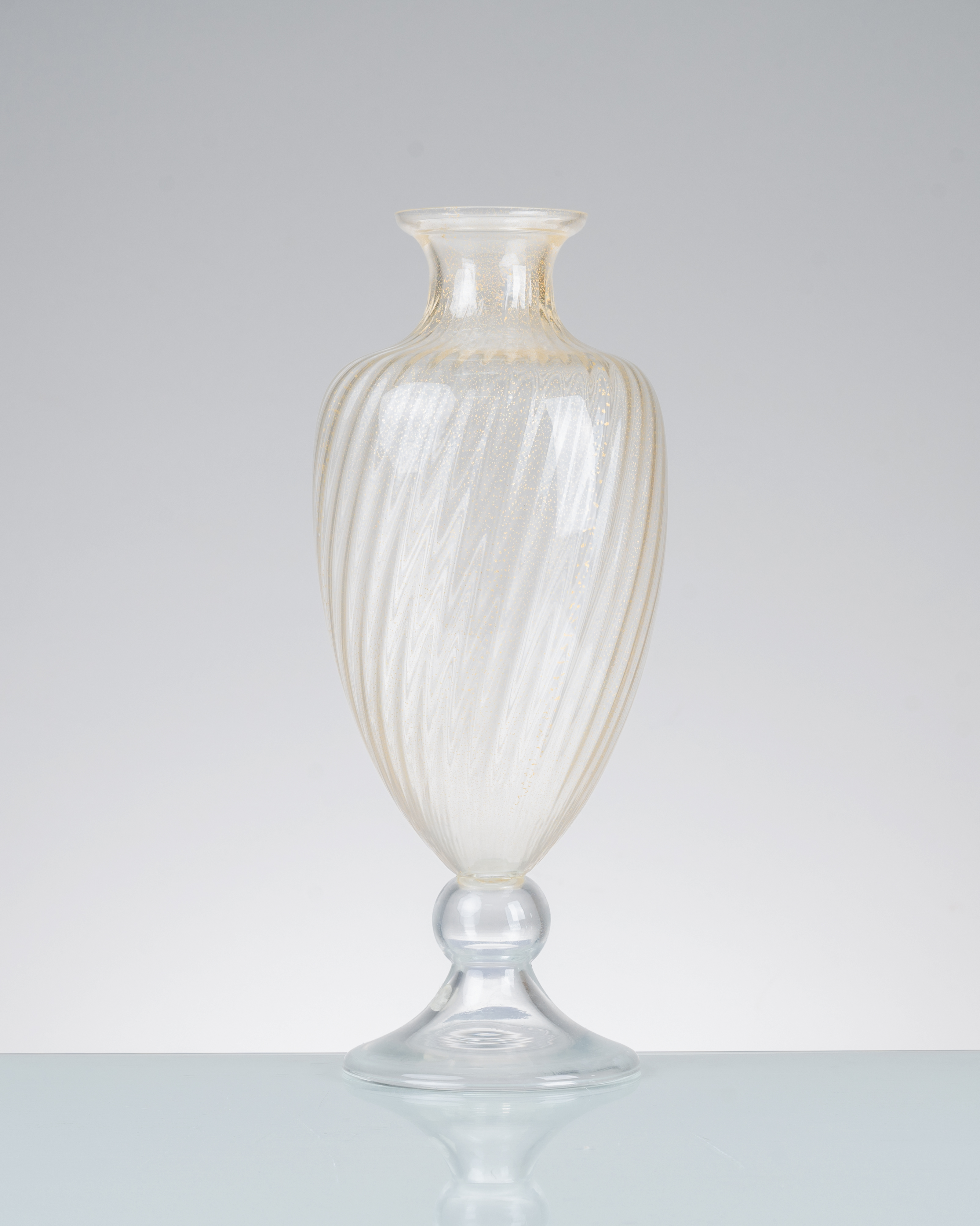 Vaso in vetro incolore con inclusioni oro, corpo ovalizzato decorato con costolature diagonali, collo a vaso, bocca circolare piana, base circolare. Tracci di vecchia etichetta.