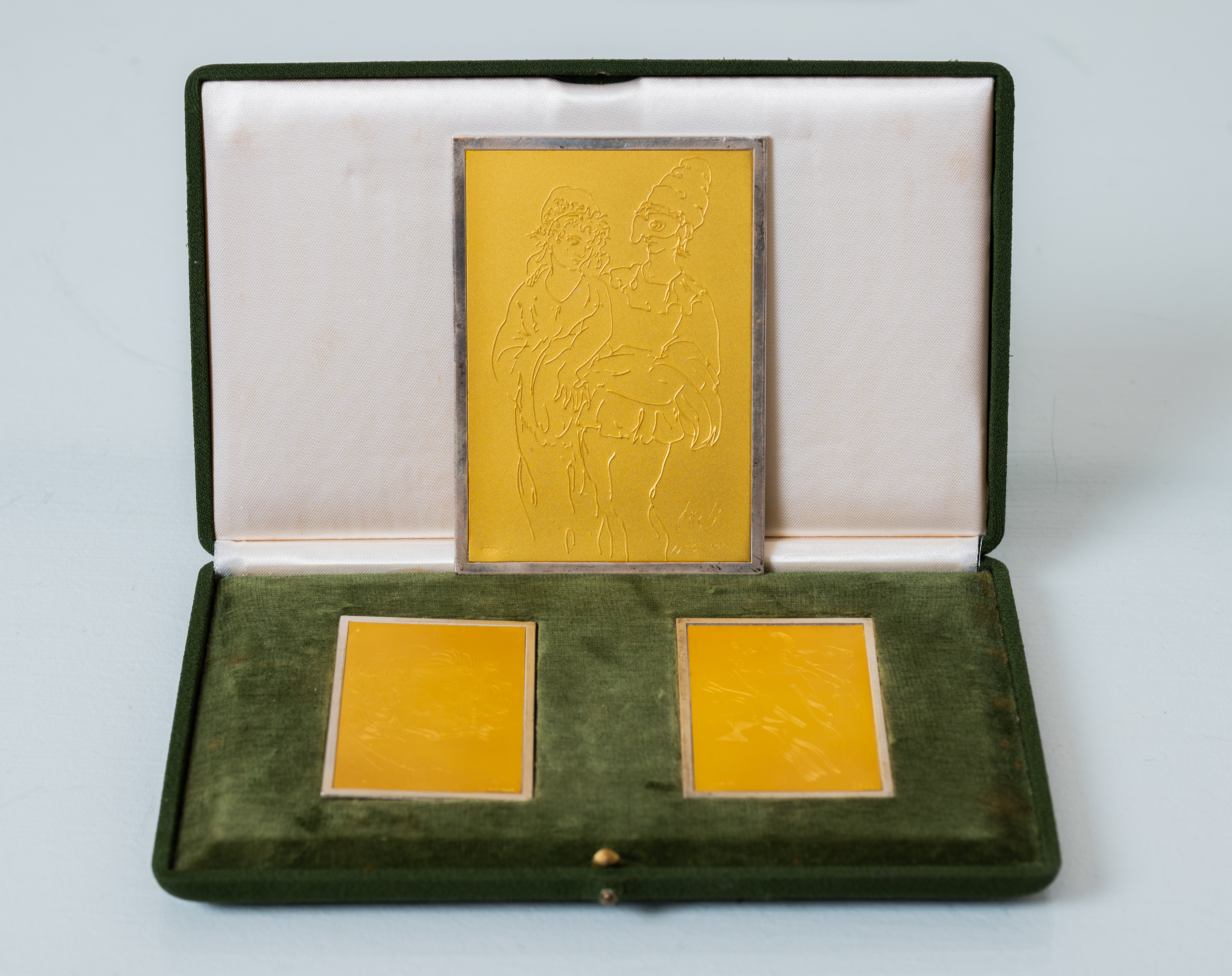 Placca in oro laminato 990 con cornice in argento 925 raffigurante "Pulcinella innamorato", es. 253/1000; placca in oro laminato 999 raffigurante "Pastore" con cornice in argento 925, es. 894/2500; placca in oro laminato raffigurante "Volto femminile" con cornice in argento 925. Firmate.