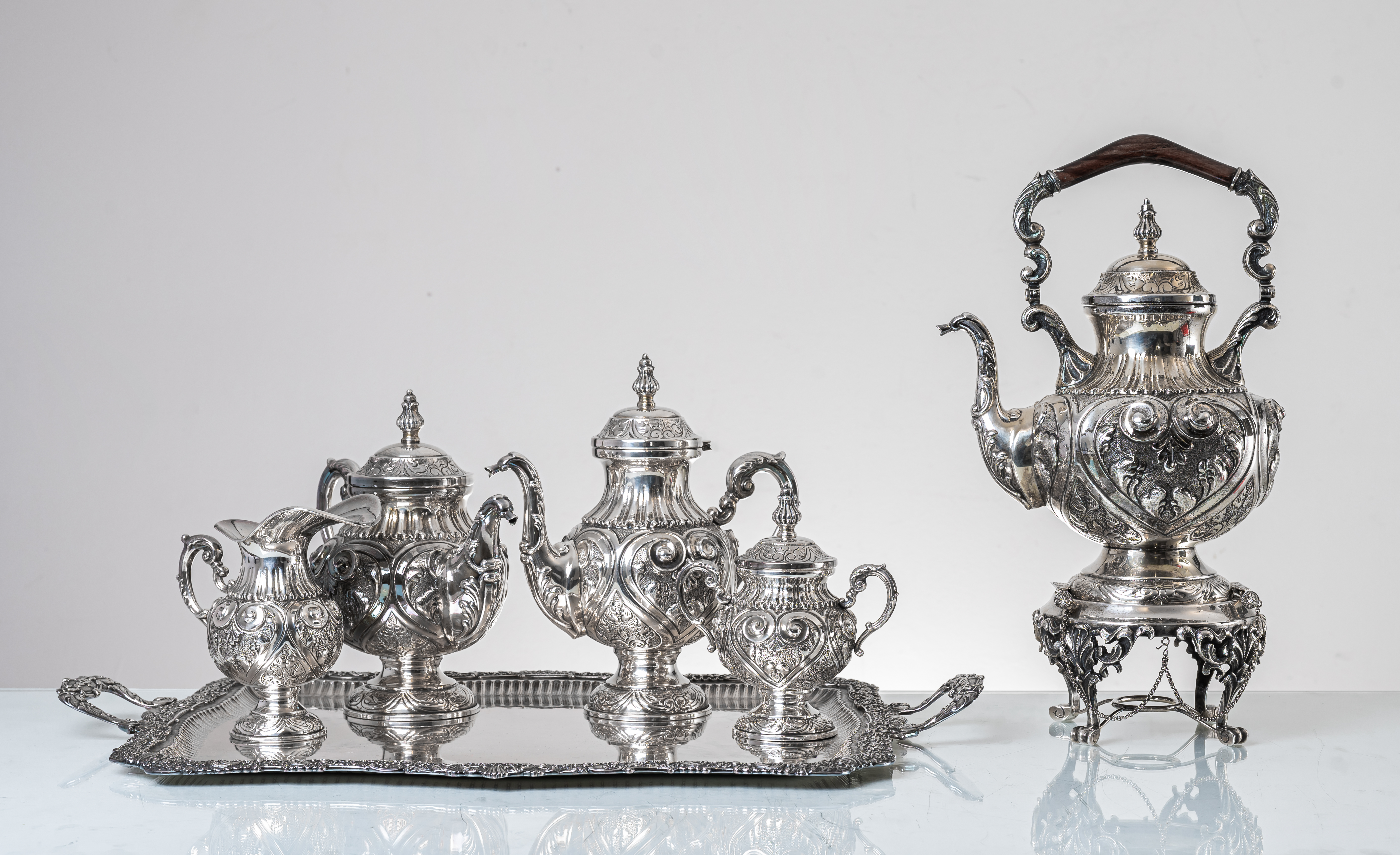 SERVIZIO in argento riccamente sbalzato e cesellato a mano a motivo naturalistico, composto da samovar con presa in legno, caffettiera, teiera, lattiera, zuccheriera e vassoio. Punzone argentiere 164 PA. (g. 9642 peso lordo).