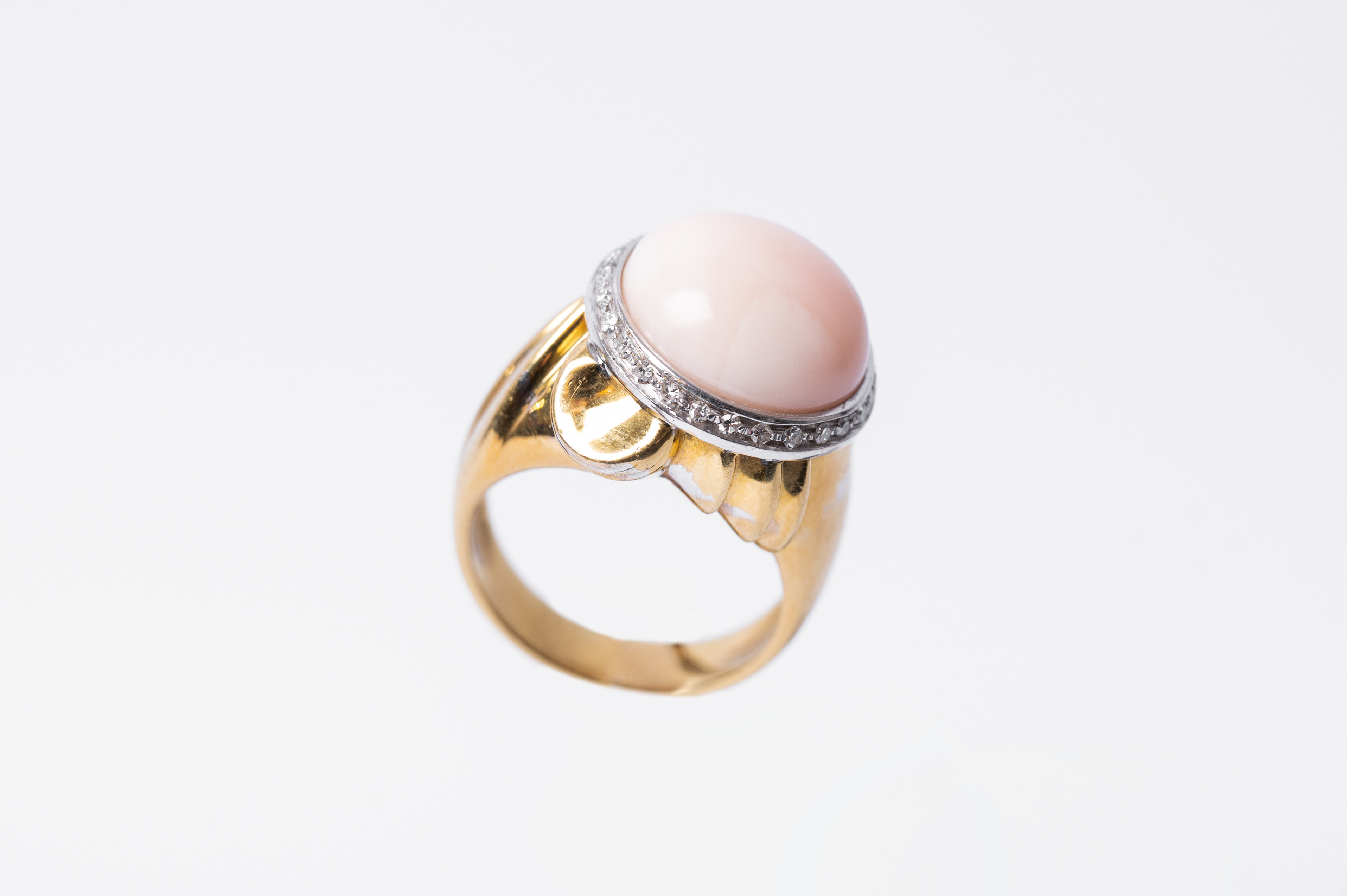 ANELLO in oro bianco e giallo 18 KT con diamanti taglio huit/huit ct. 0,20 peso di stima e corallo rosa (g. 14,10).