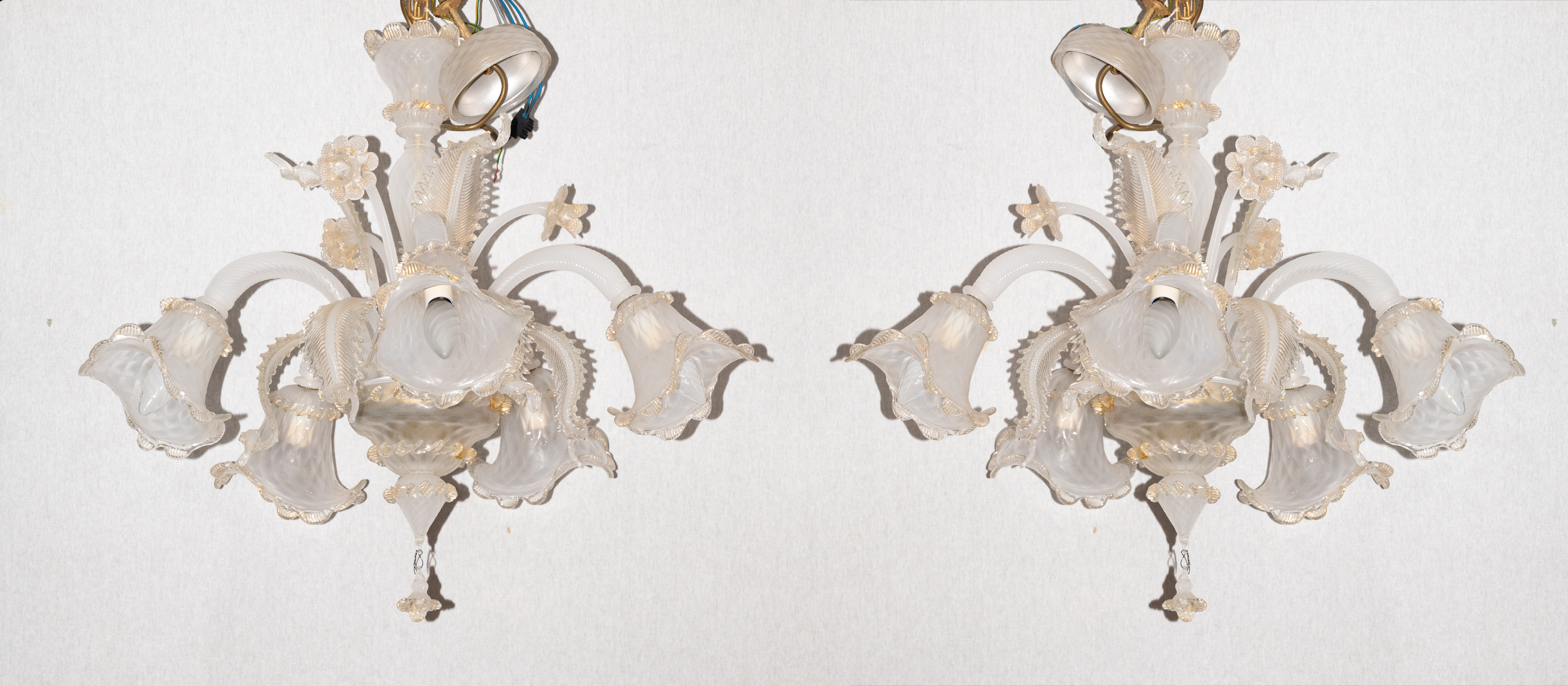 Coppia di lampadari a cinque luci in vetro bianco con lumeggiature in oro (usure e mancanze).