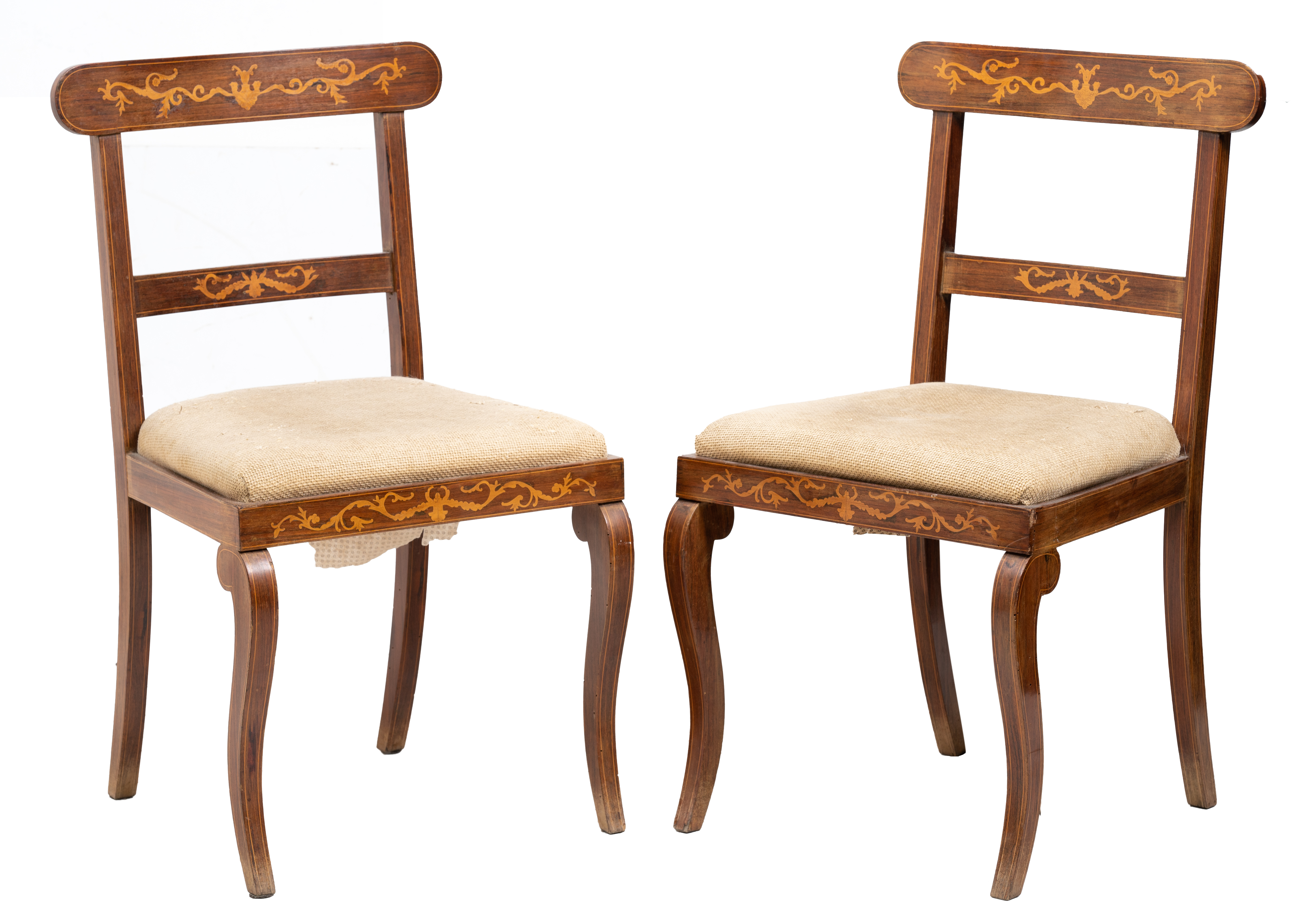 Coppia di sedie stile Carlo X in legno esotico e tarsie in bosso.