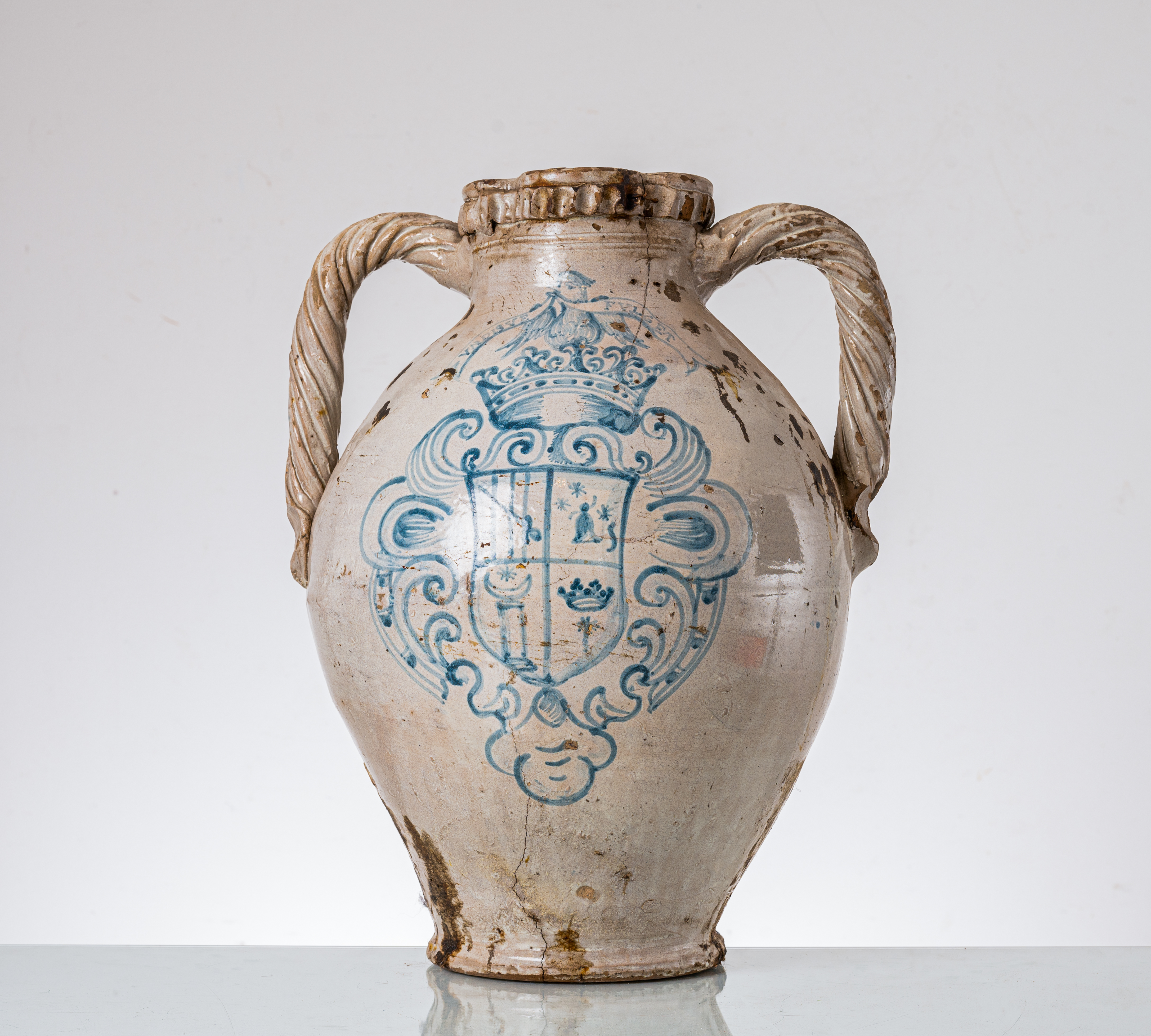 Orcio datato nel retro 1726 in ceramica smaltata e decorata con stemma araldico nei toni del blu con corona (usure e rotture).