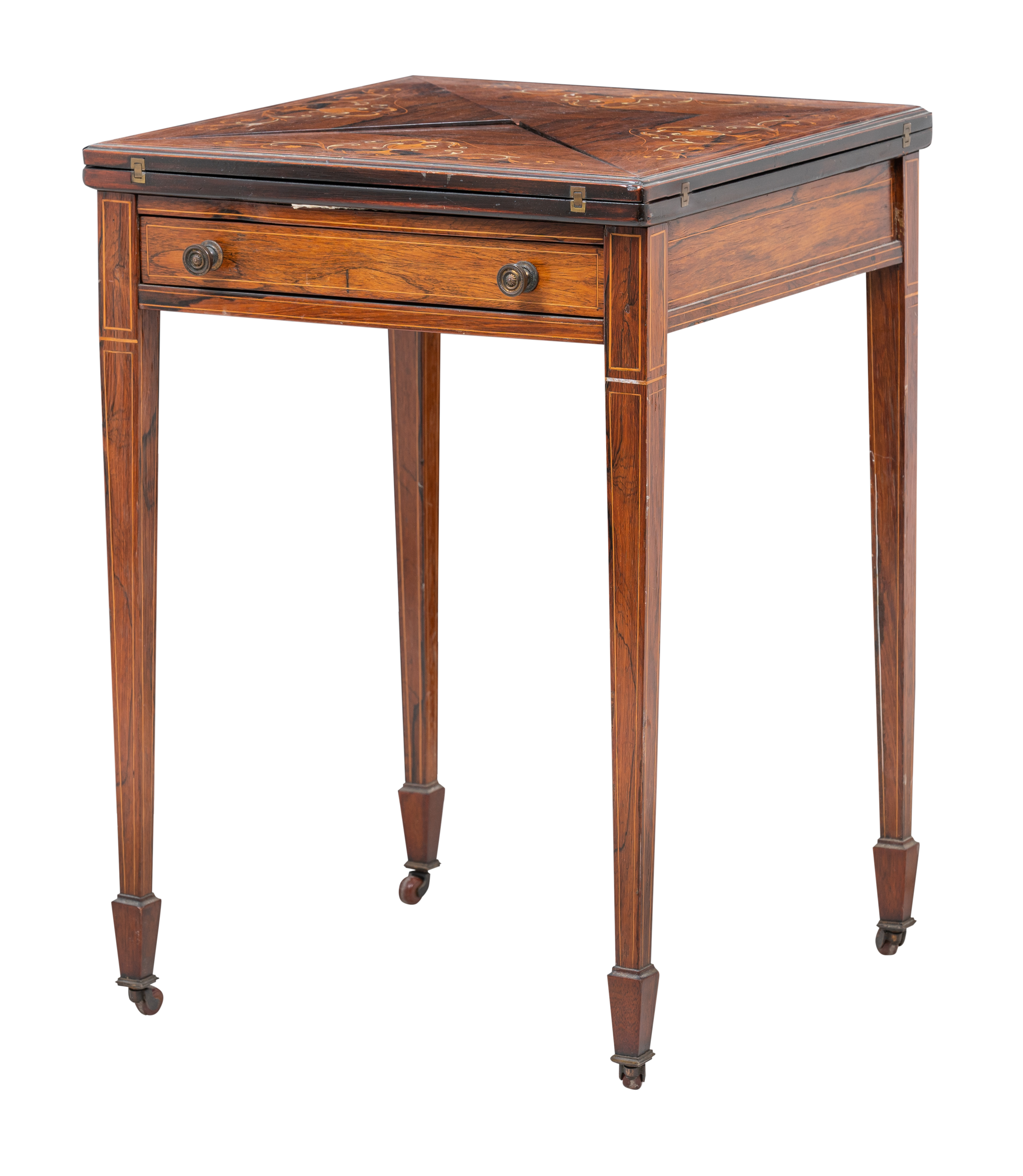 Tavolino da gioco a fazzoletto con cassetto laterale in legno esotico, tarsie in bosso e osso.