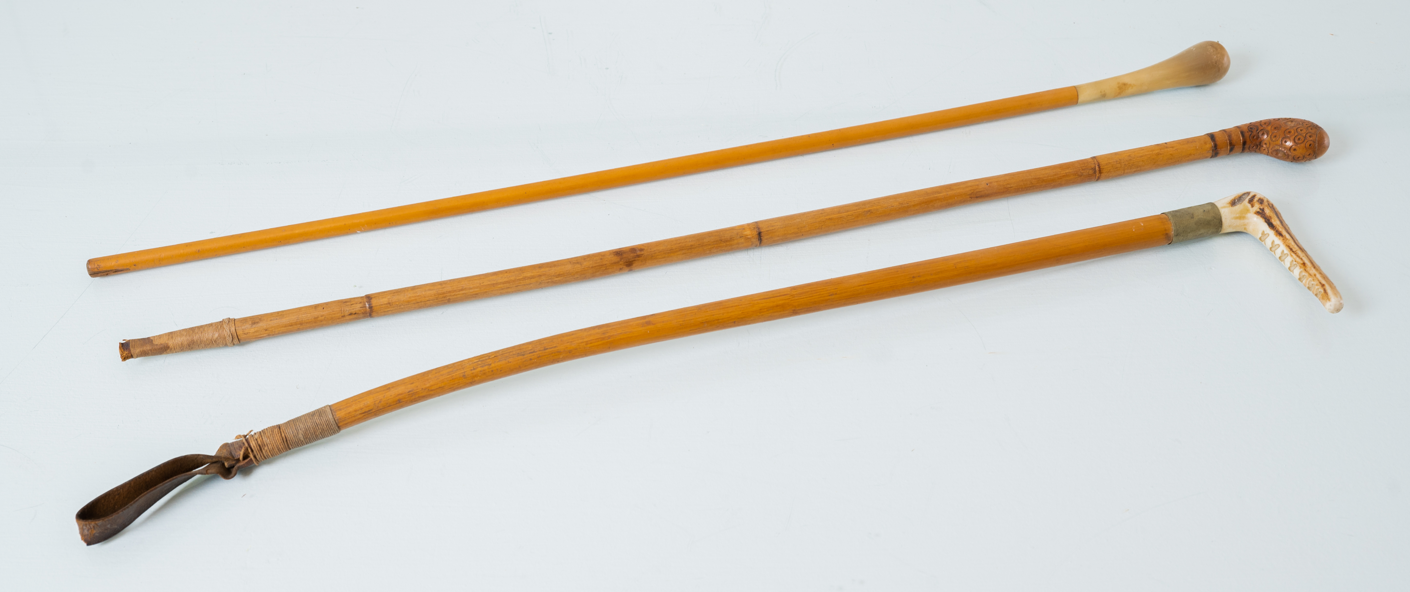 Tre frustini di cui uno in interamente in legno e due in legno con manici in osso.
