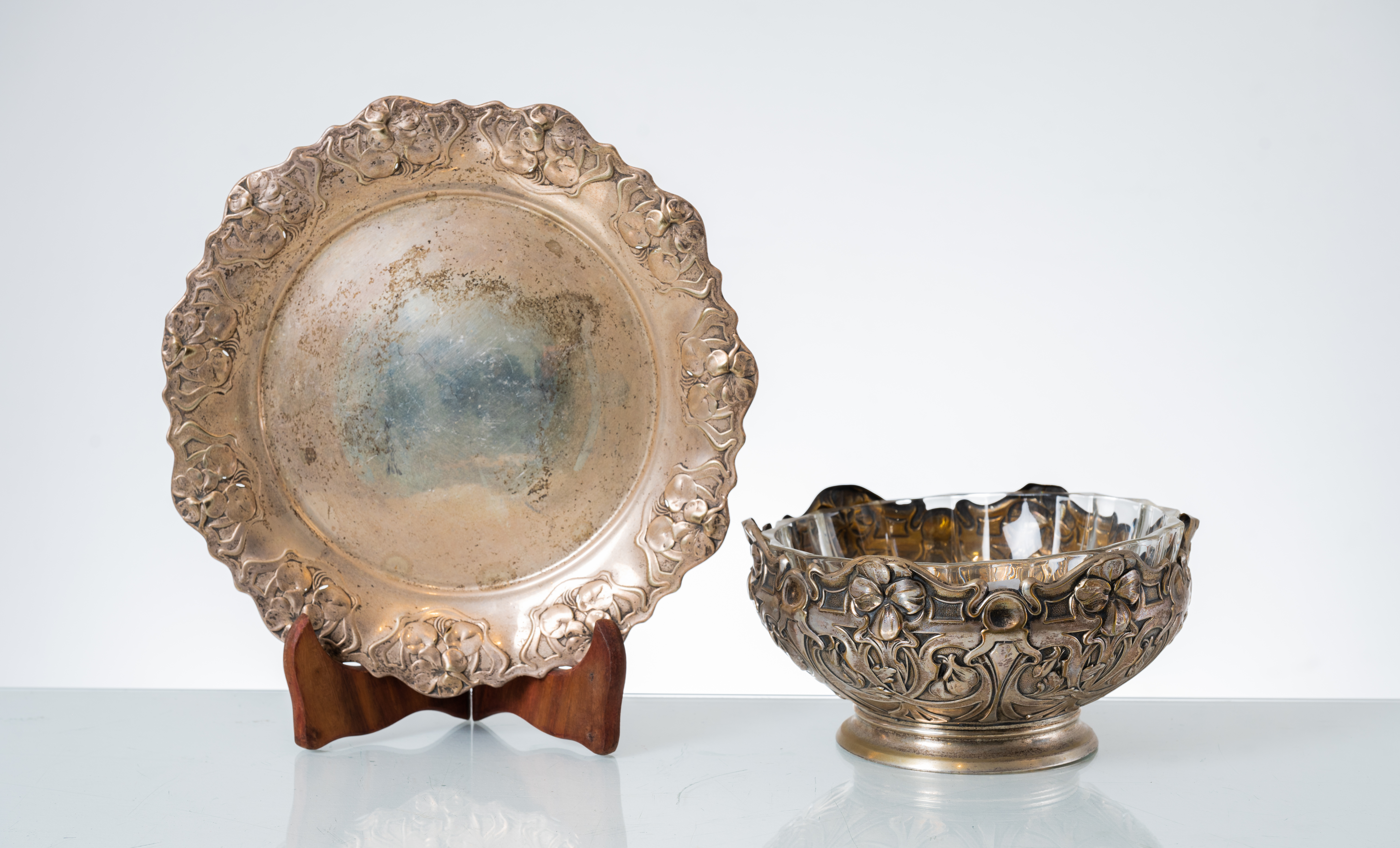 Centrotavola in metallo argentato con ciotola in vetro, periodo Liberty.
