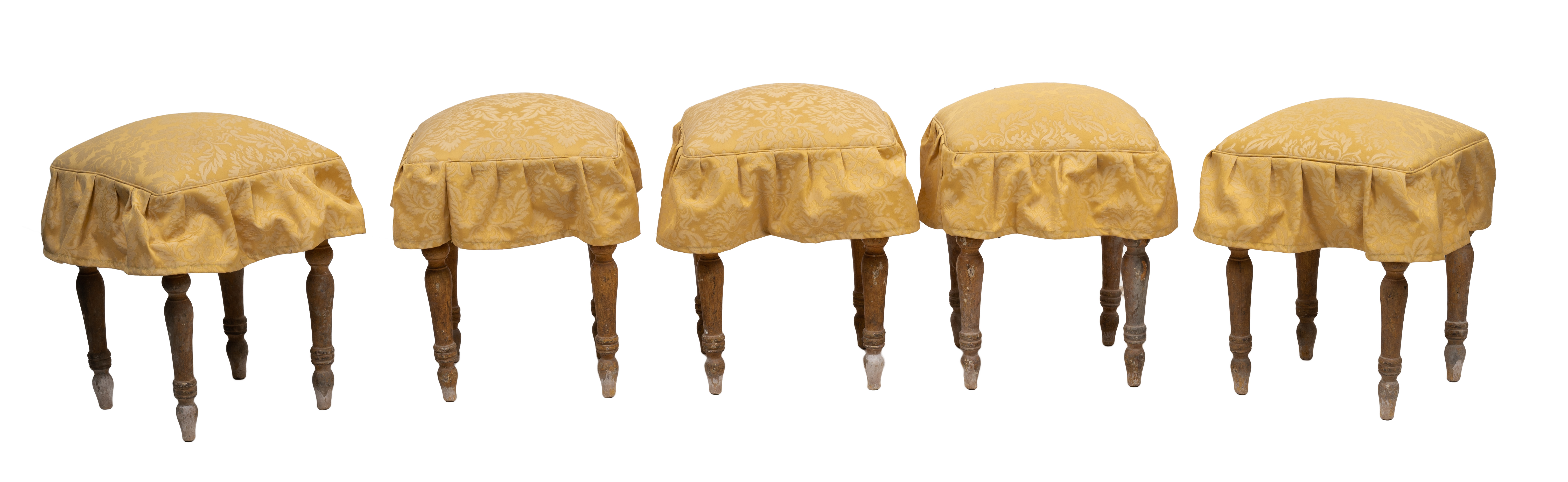 Cinque sgabelli in legno con seduta imbottita, tappezzeria nei toni del giallo damascato.