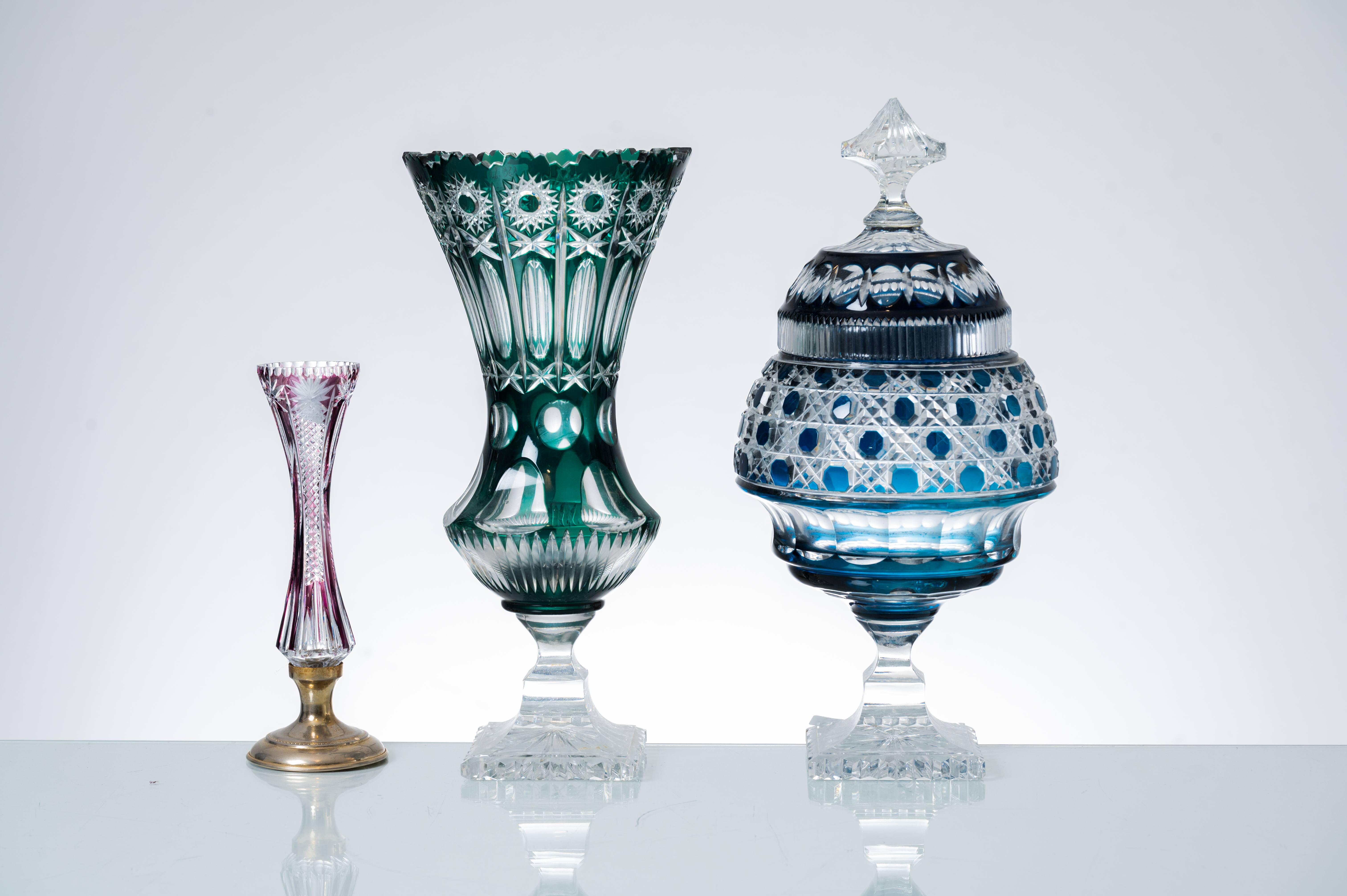 Due portafiori di cui uno con base in argento e potiche in vetro bianco e colorato Boemia.