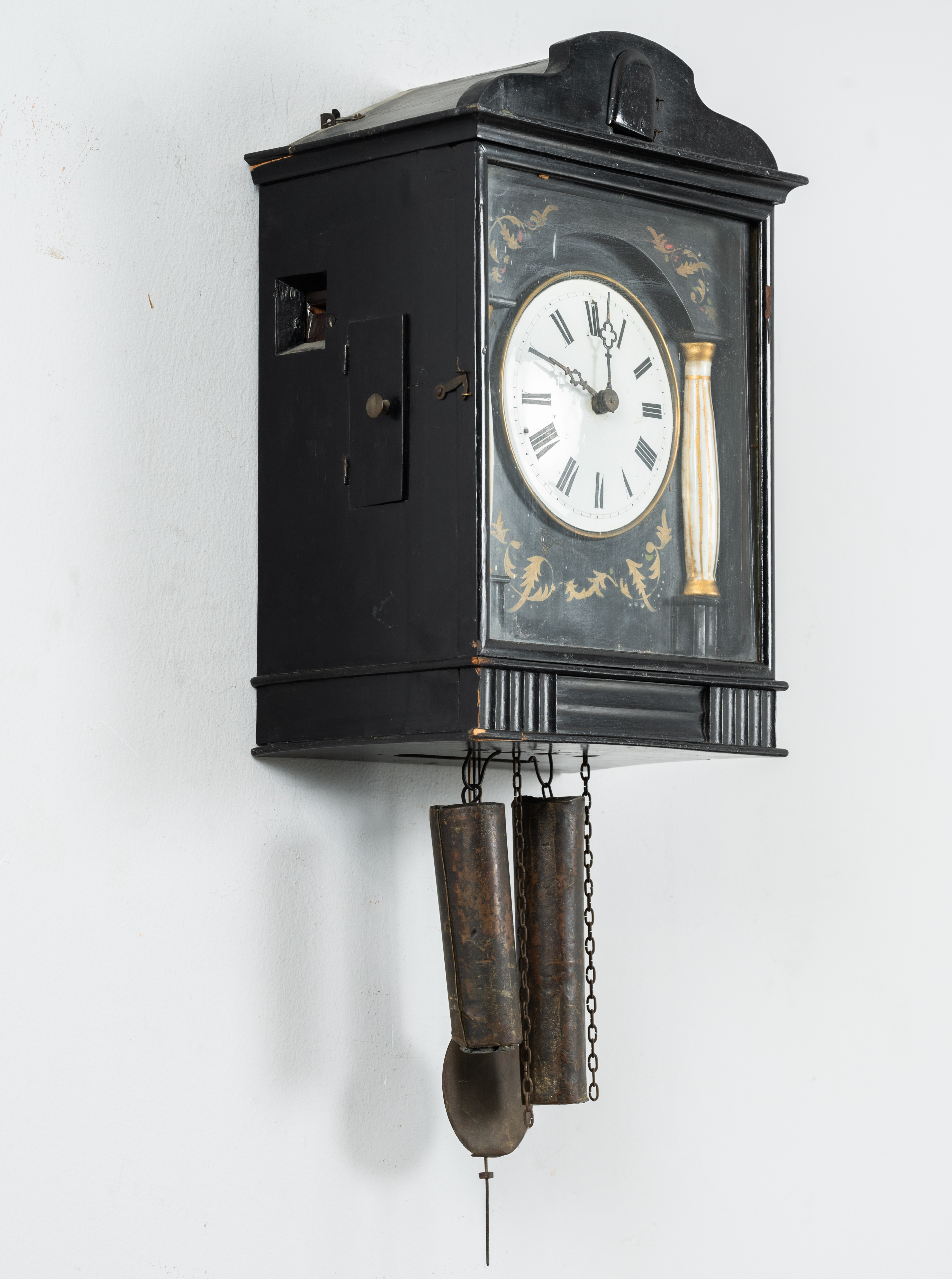 Orologio da muro in legno ebanizzato, quadrante smaltato a numeri romani, mezze colonne in porcellana e tarsie in rame.