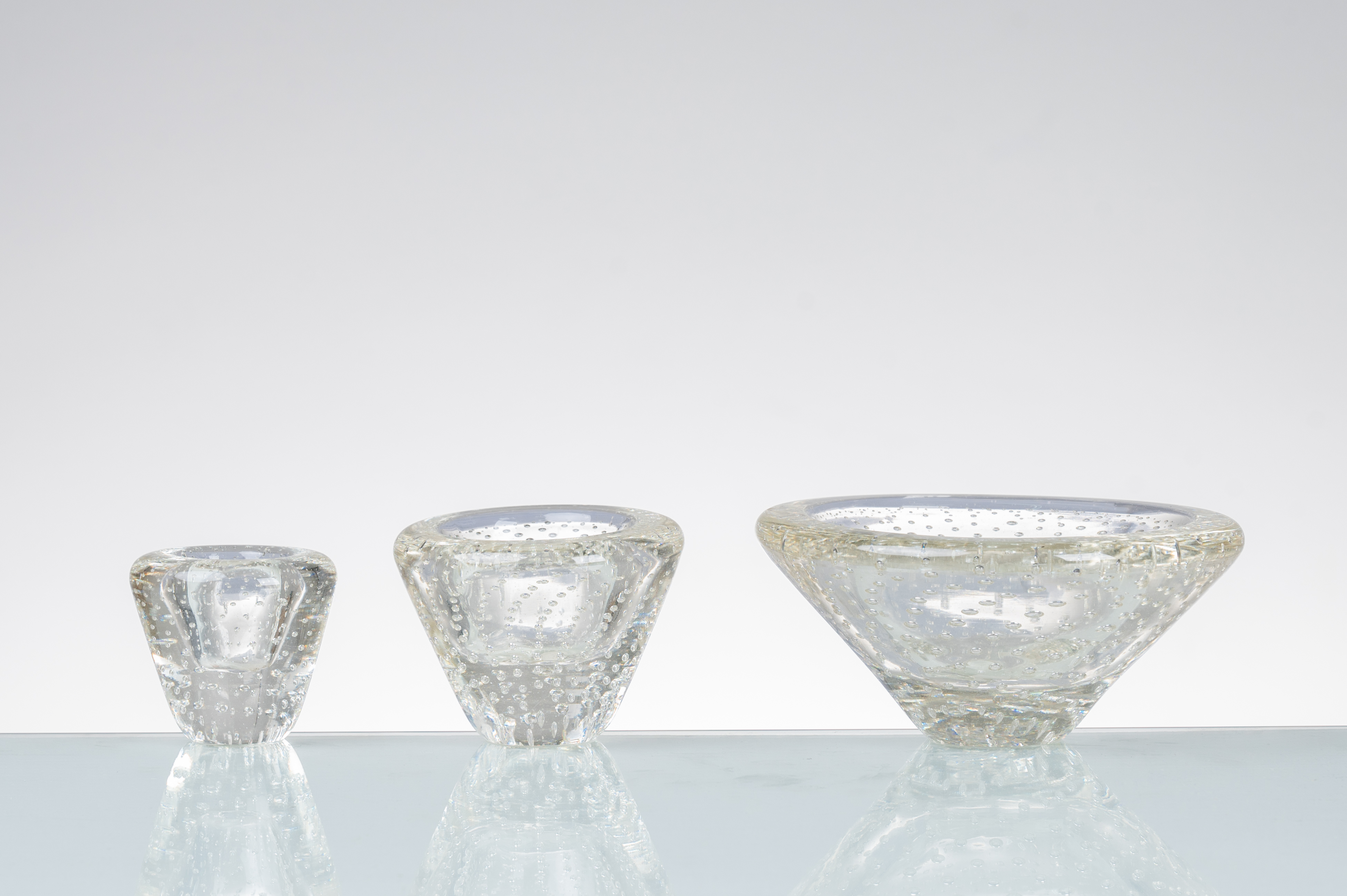 Tre ciotole di dimensione diversa in vetro trasparente ed incolore bullicante, corpo conico con bocca circolare piana.