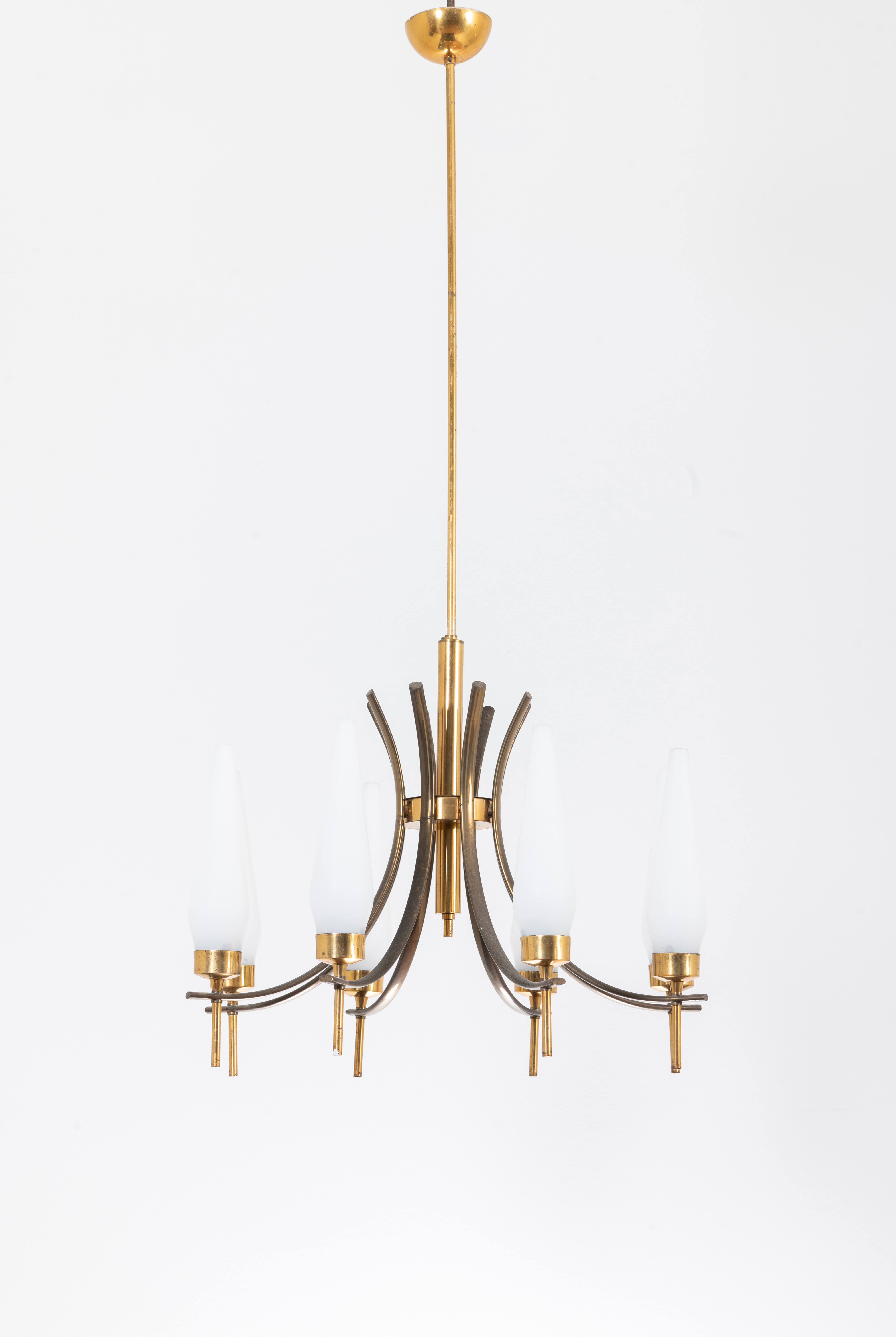 Lampada a sospensione a otto luci modello "12630", struttura in ottone composta da bracci semicircolari e da diffusori in vetro opale satinato bianco.