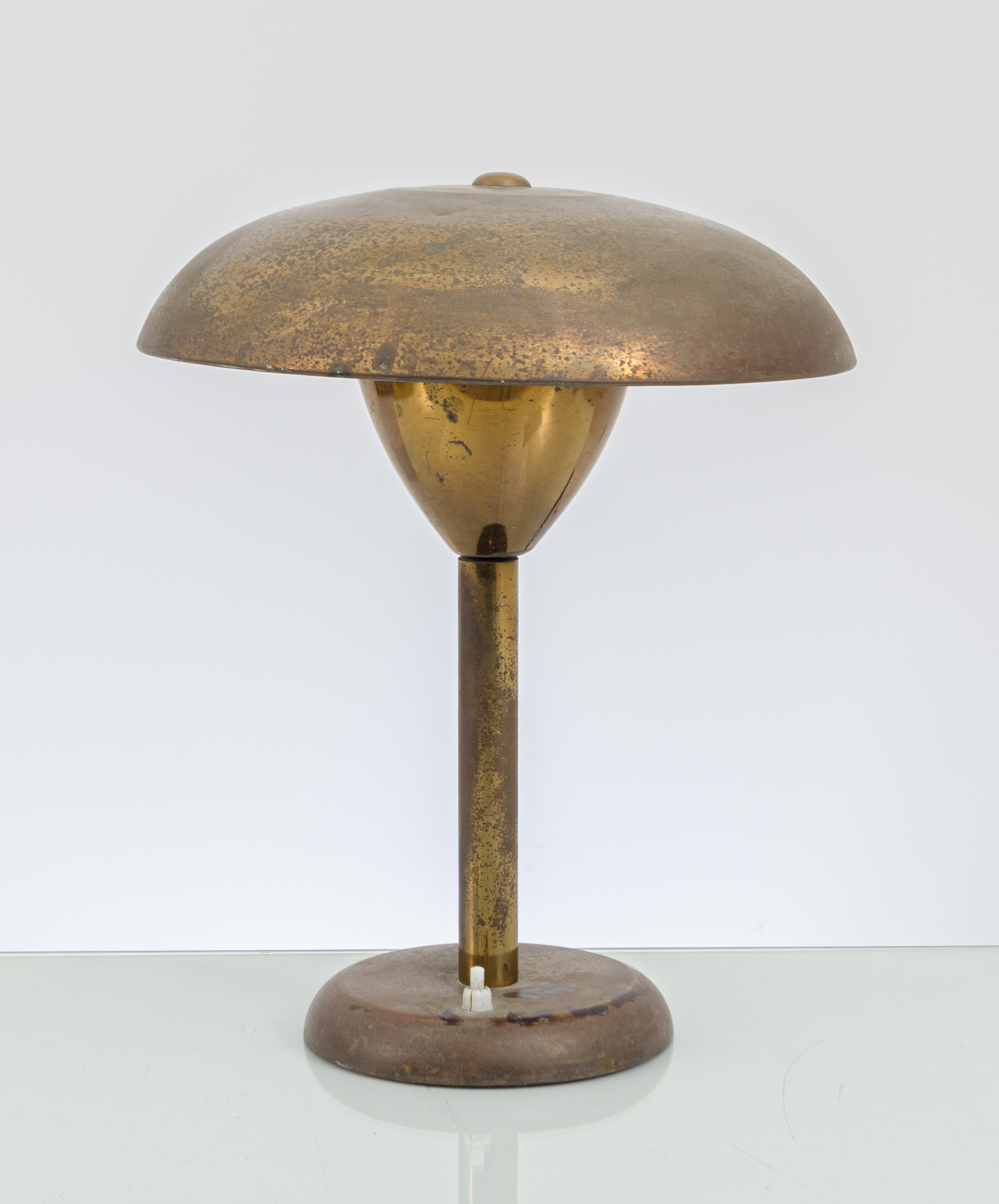 Lampada da tavolo ad una luce, struttura in ottone con diffusore semisferico schiacciato. Impianto elettrico originale. Ossidazioni alle parti metalliche e piccoli punti di ruggine.