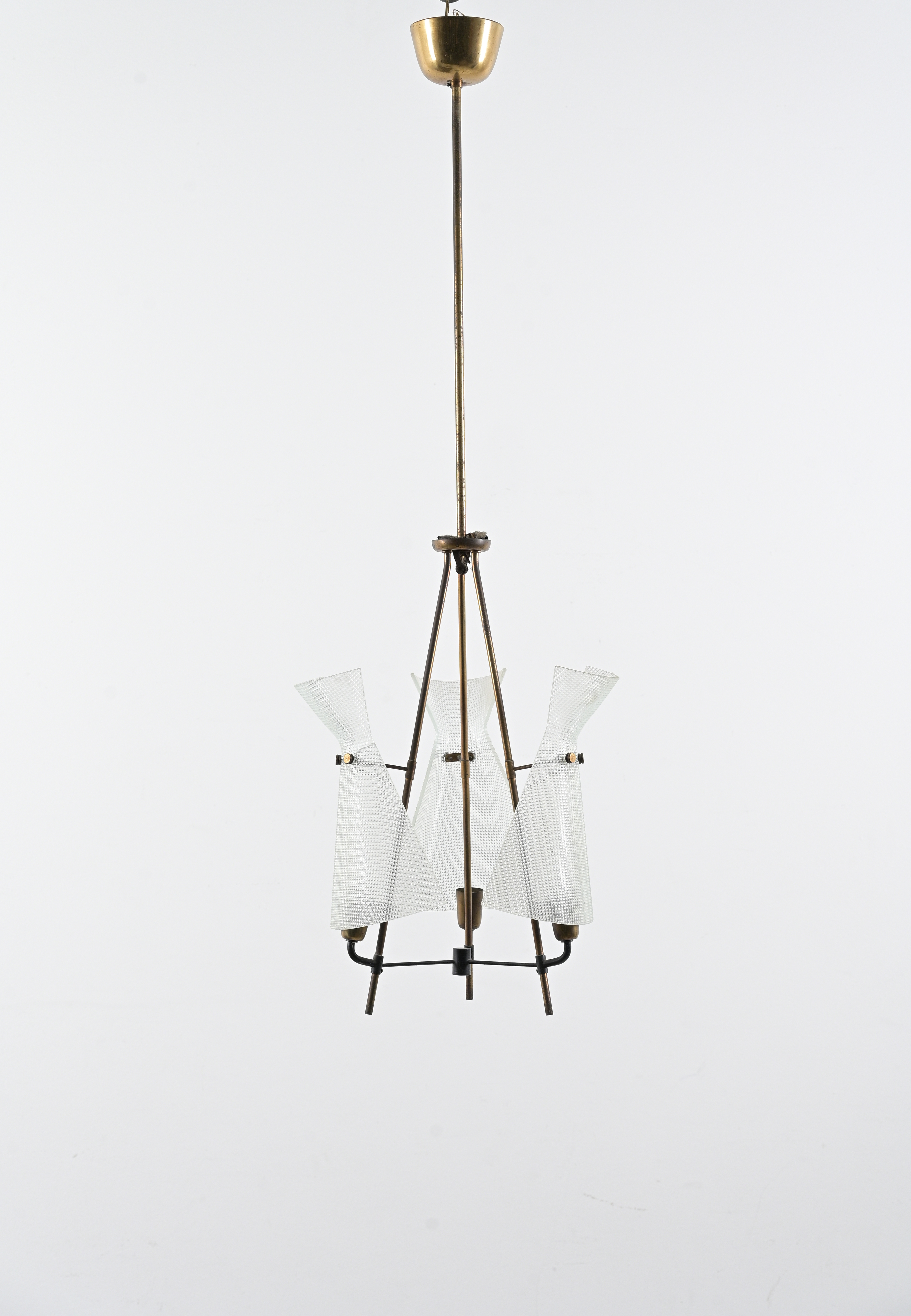 Lampada a sospensione a tre luci, struttura in ottone con diffusori a semi clessidra in vetro a stampo incolore. Un filè su un vetro e lievi ossidazioni.