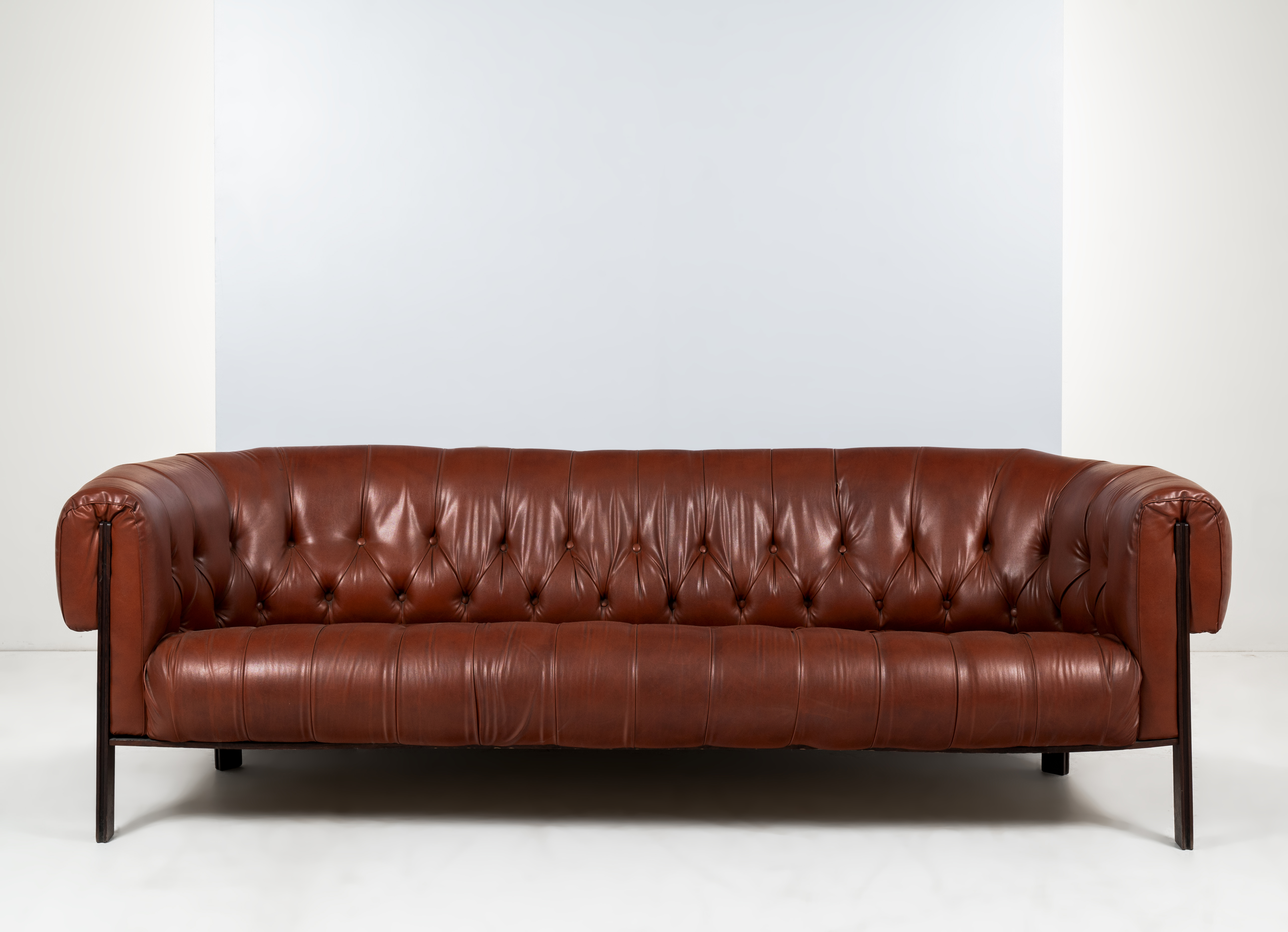 Divano tre posti con struttura in legno esotico, imbottitura e rivestimento in pelle marrone a lavorazione capitonnè.