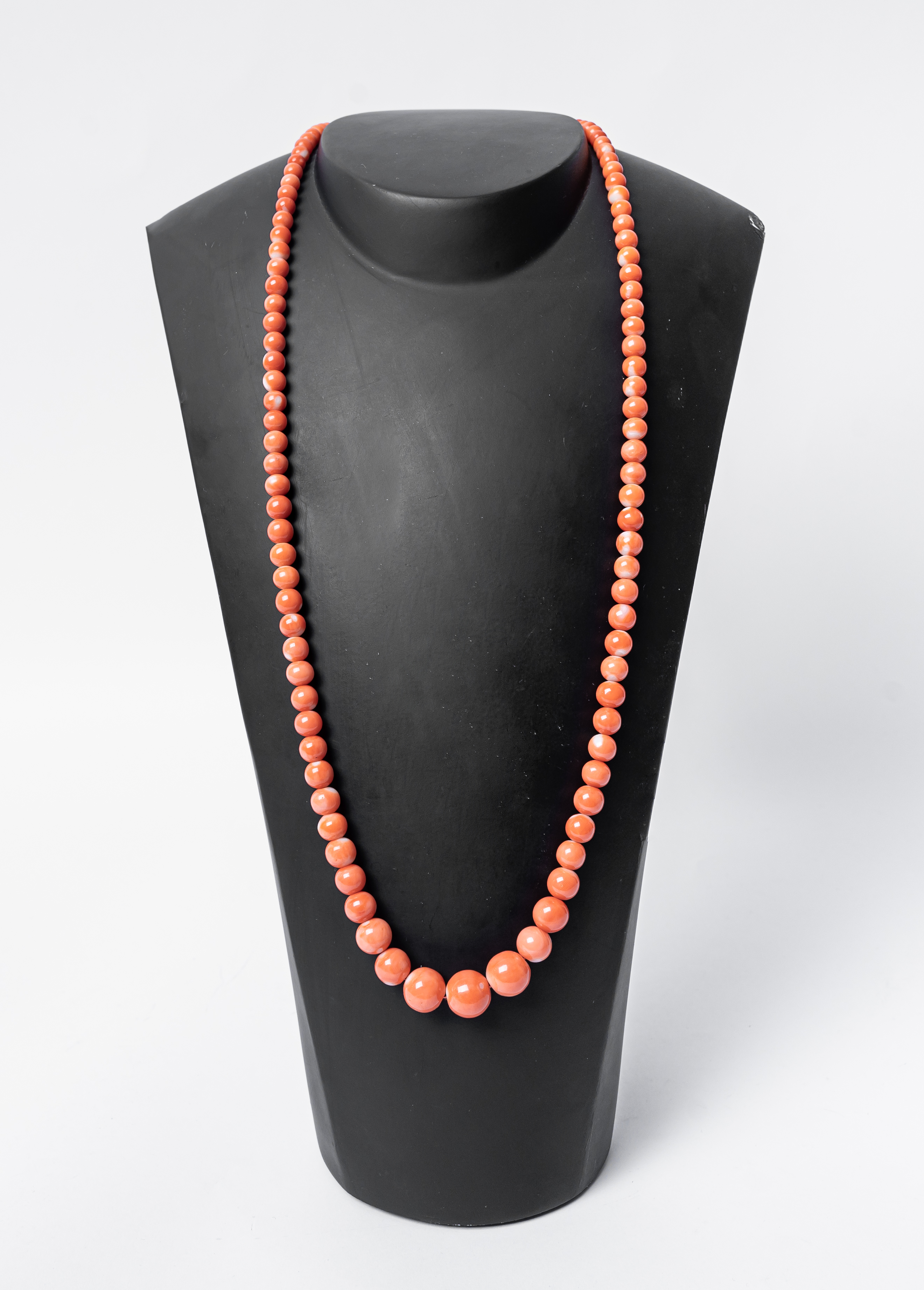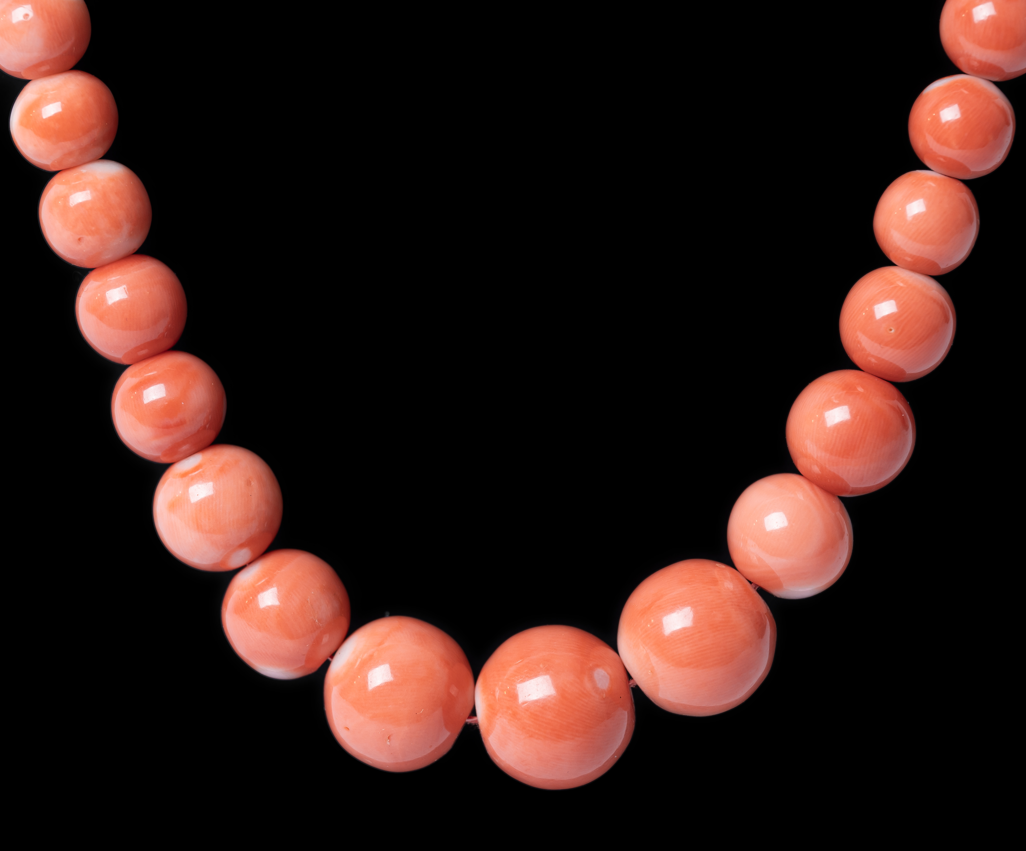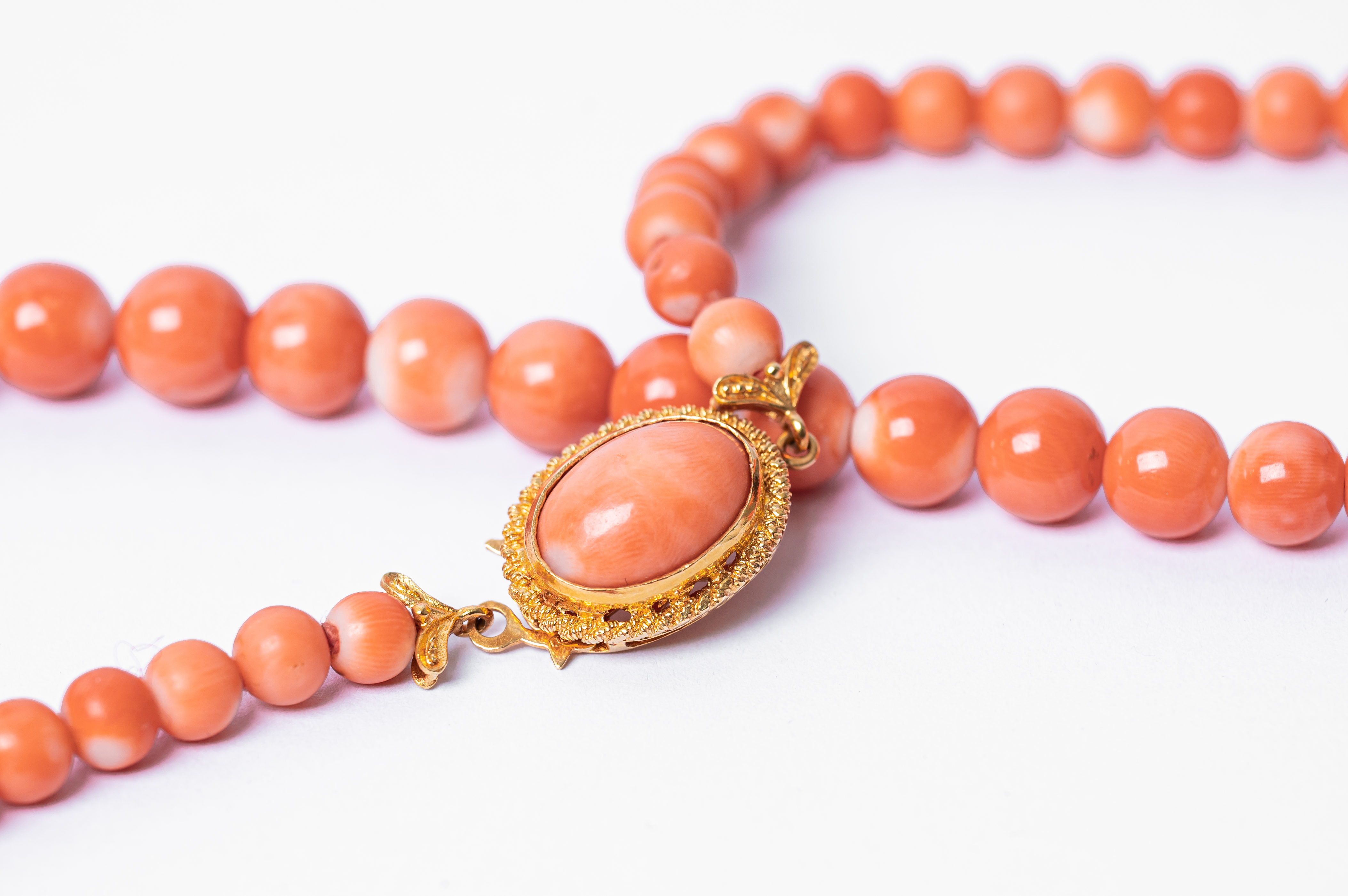 COLLANA con sfere in corallo salmone a degradare, susta in oro giallo 18 KT con cabochon di corallo (g. 67,50).