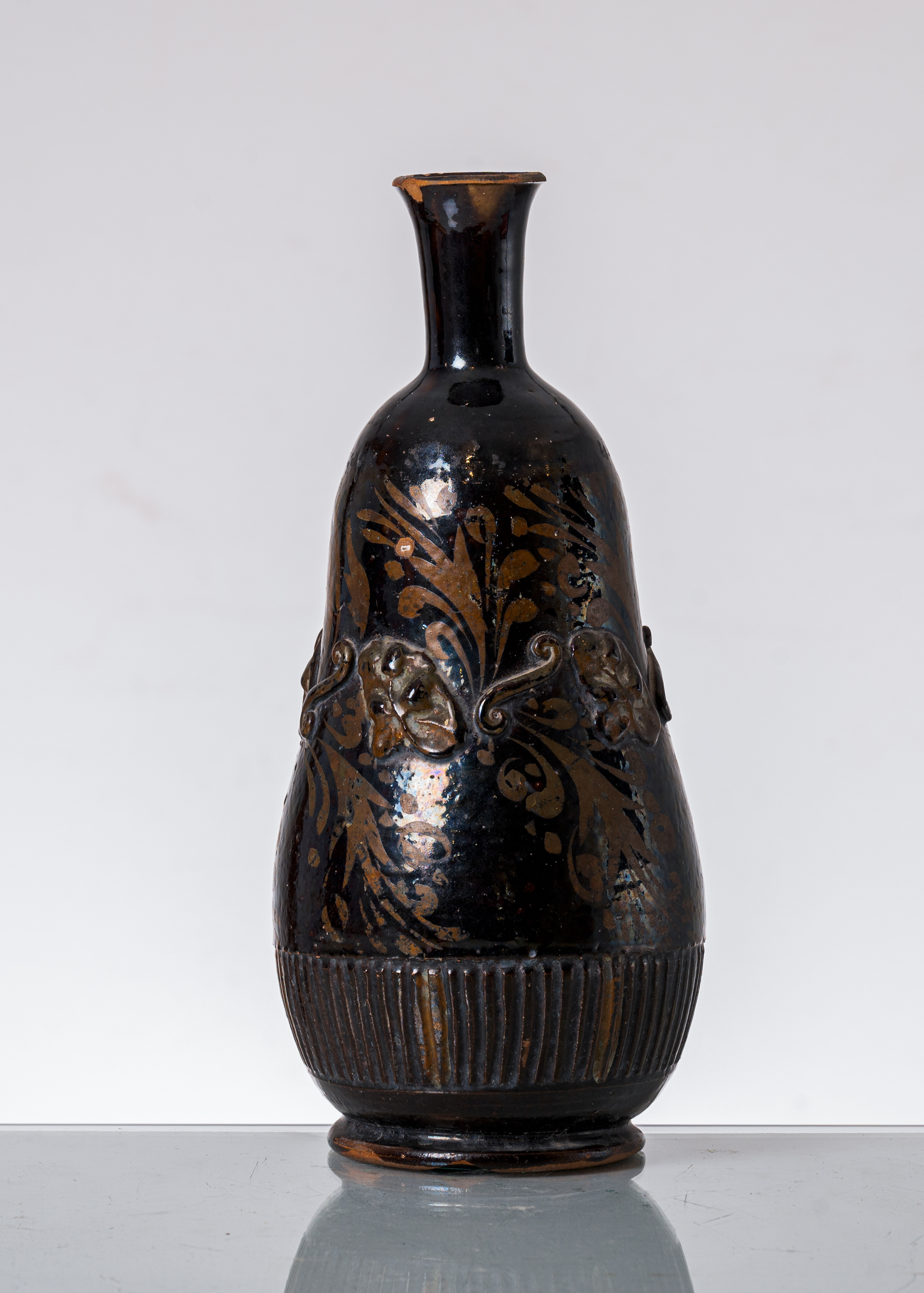 Bottiglia in ceramica smaltata e decorata nei toni del nero e decori nei toni del bronzo.