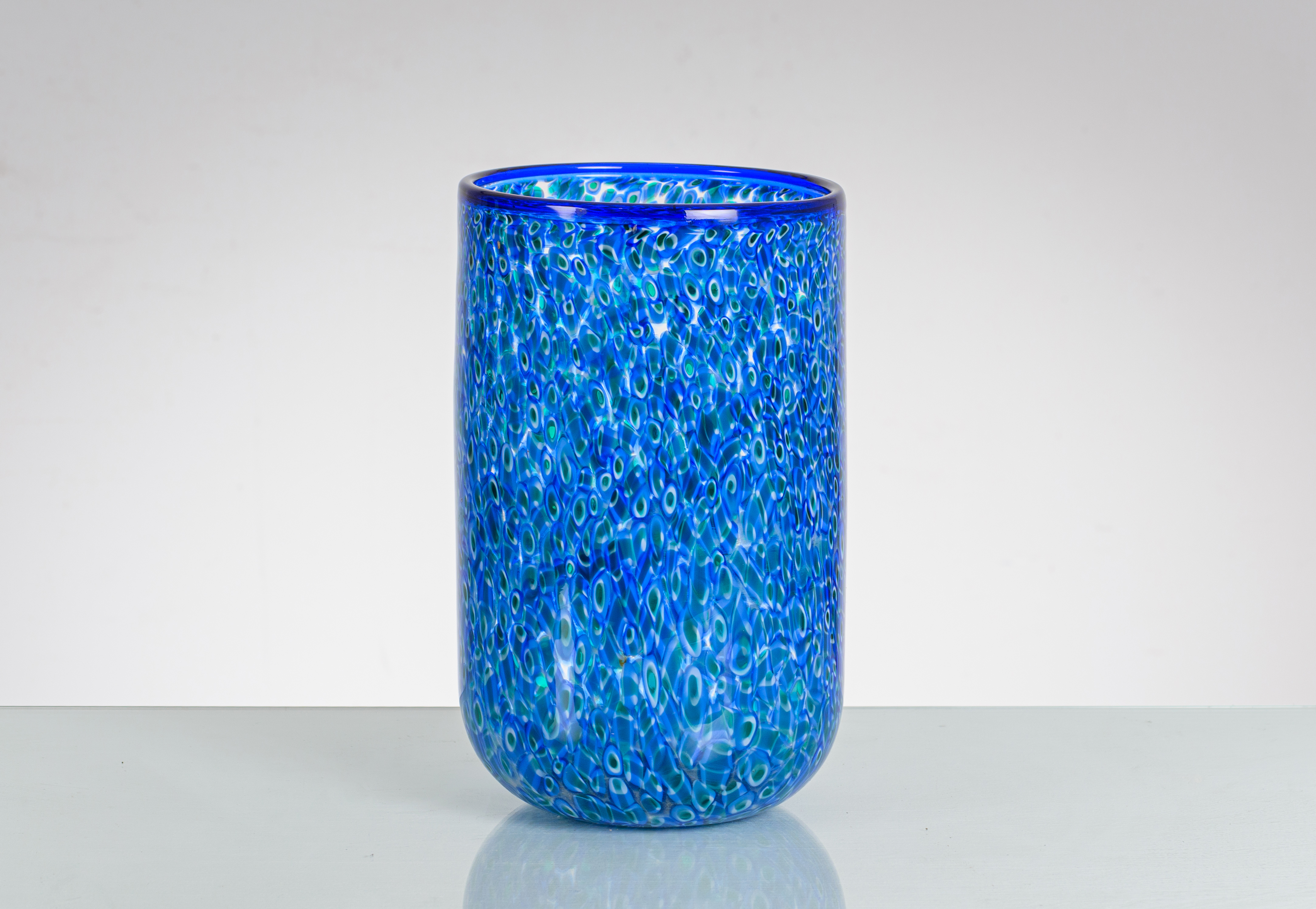Vaso in vetro soffiato decorato con murrine blu, verdi e bianche, corpo cilindrico con bocca piana circolare. Firma a graffio.
