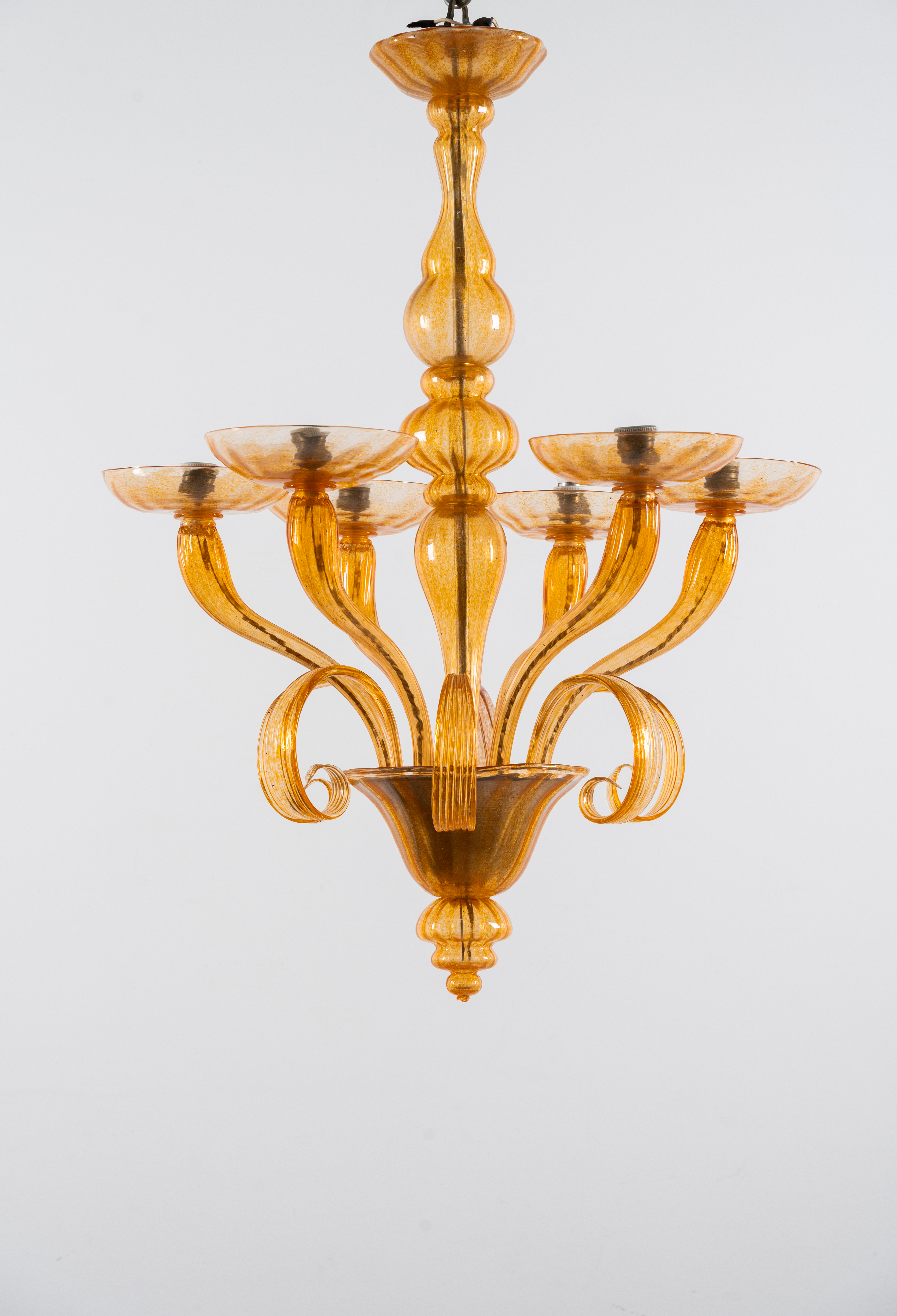 Lampada a sospensione a sei luci in vetro soffiato ambra, struttura in metallo, sei bracci montanti curvati, riccioli, coppe circolari, fusto sagomato.