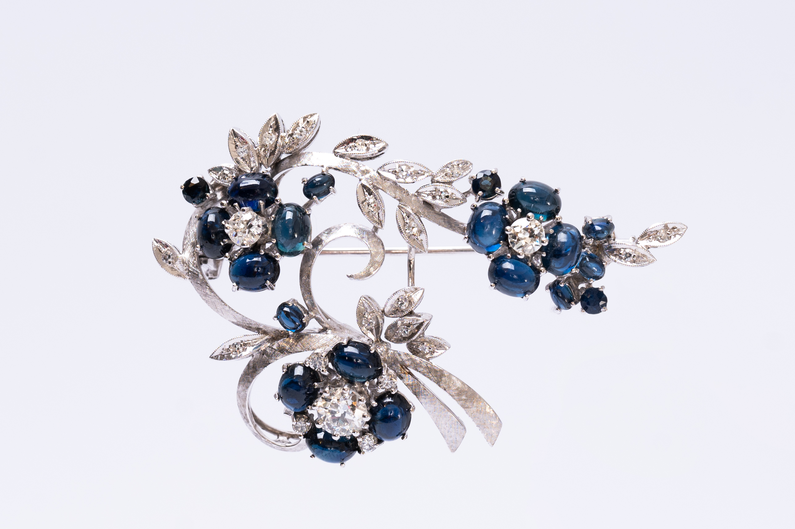 SPILLA/PENDENTE in oro bianco 18 KT con diamanti taglio huit/huit ct. 0,08 peso di stima, diamanti taglio brillante ct. 0,60 peso di stima J COLOR SI1, zaffiri tondi ct. 0,06 peso di stima e zaffiri cabochon ct. 1,00 peso di stima (g. 20,10).