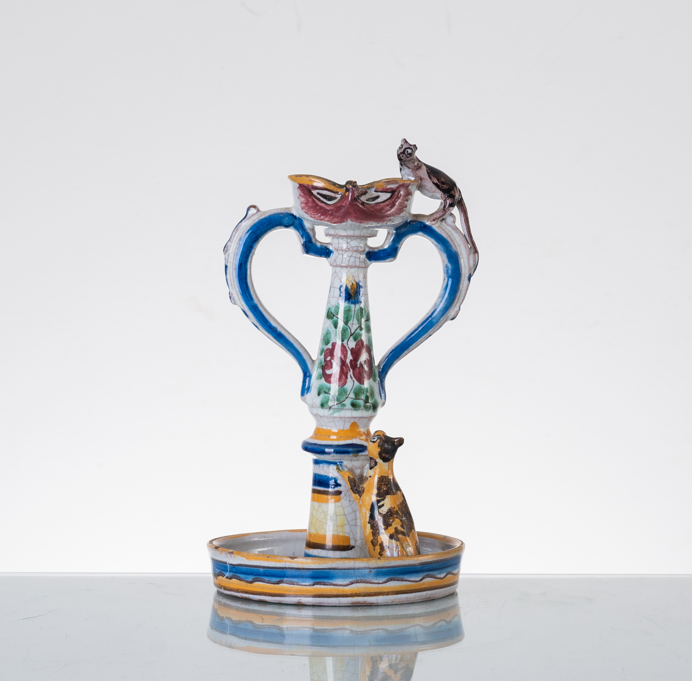 Lumiera in ceramica smaltata e decorata con gatti (usure).