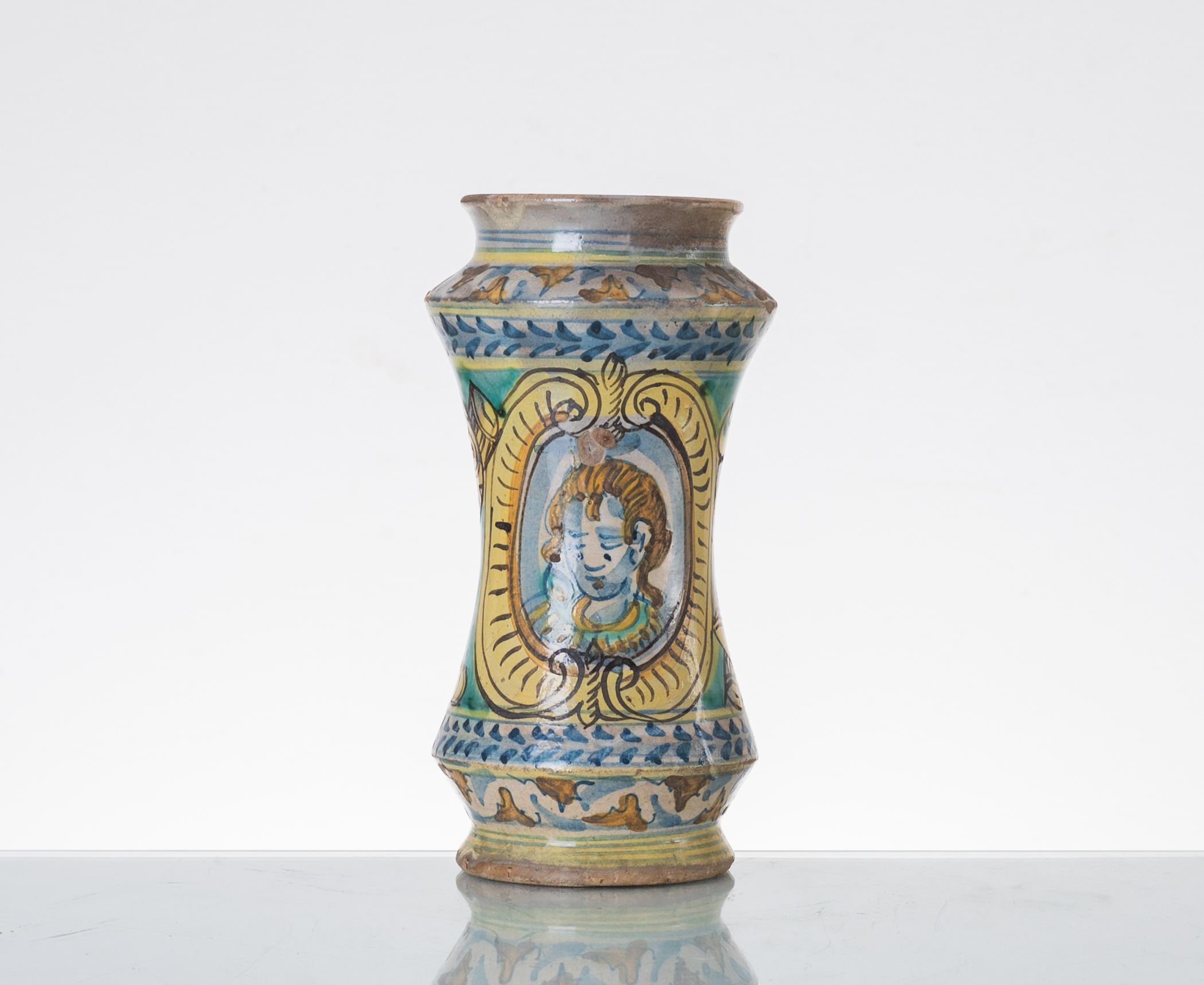 Albarello in ceramica smaltata e decorata con medaglione raffigurante "Mezzo busto di figura" (usure e restauri).