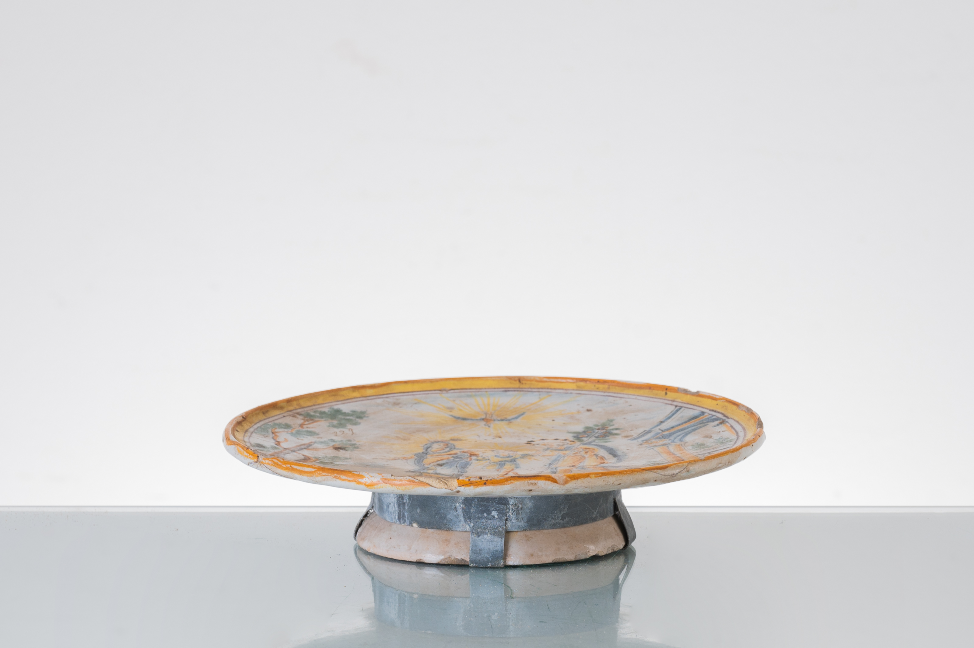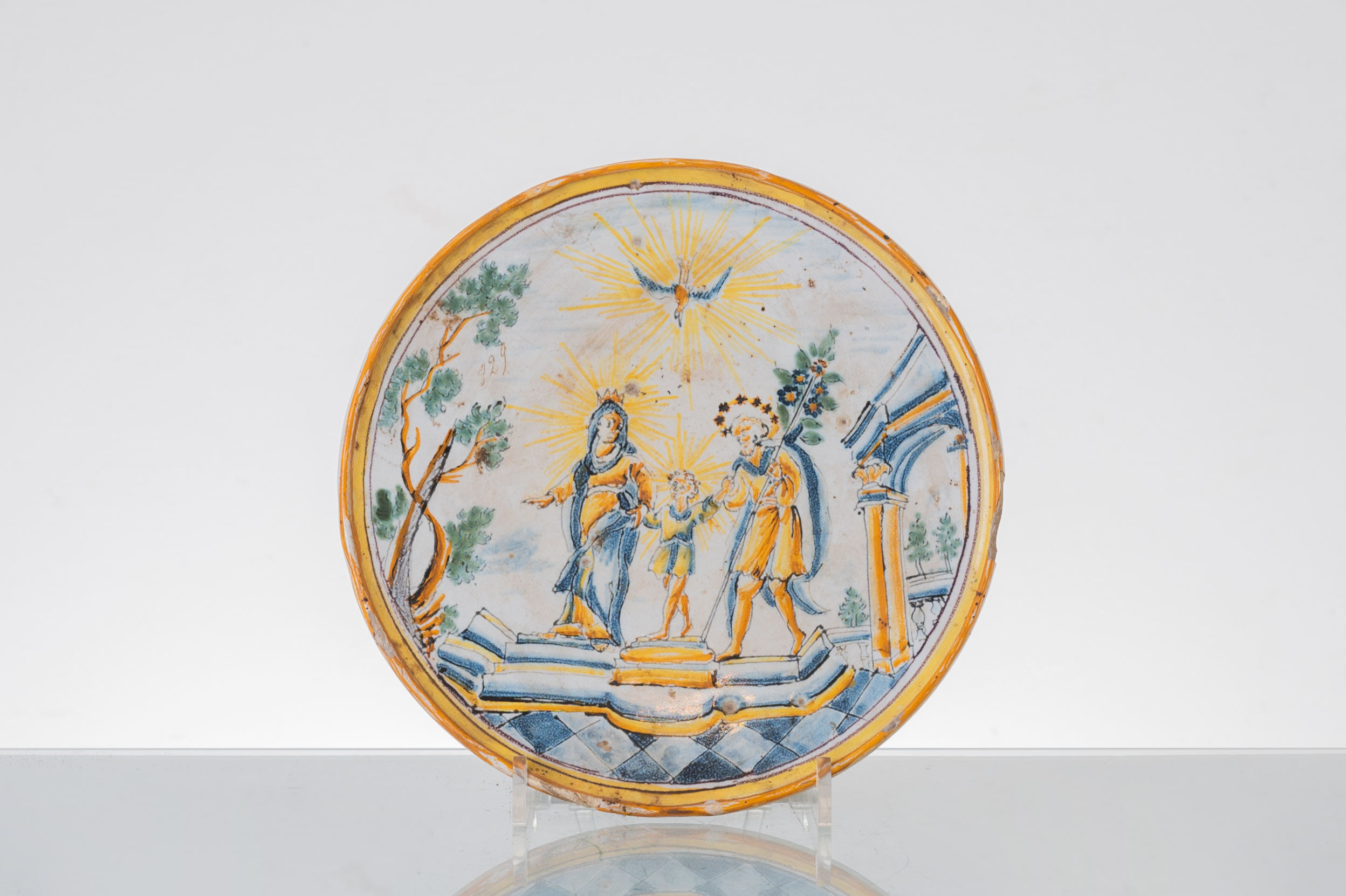 Crispina in ceramica smaltata e decorata raffigurante "Paesaggio con Sacra Famiglia e Spirito Santo" (usure).