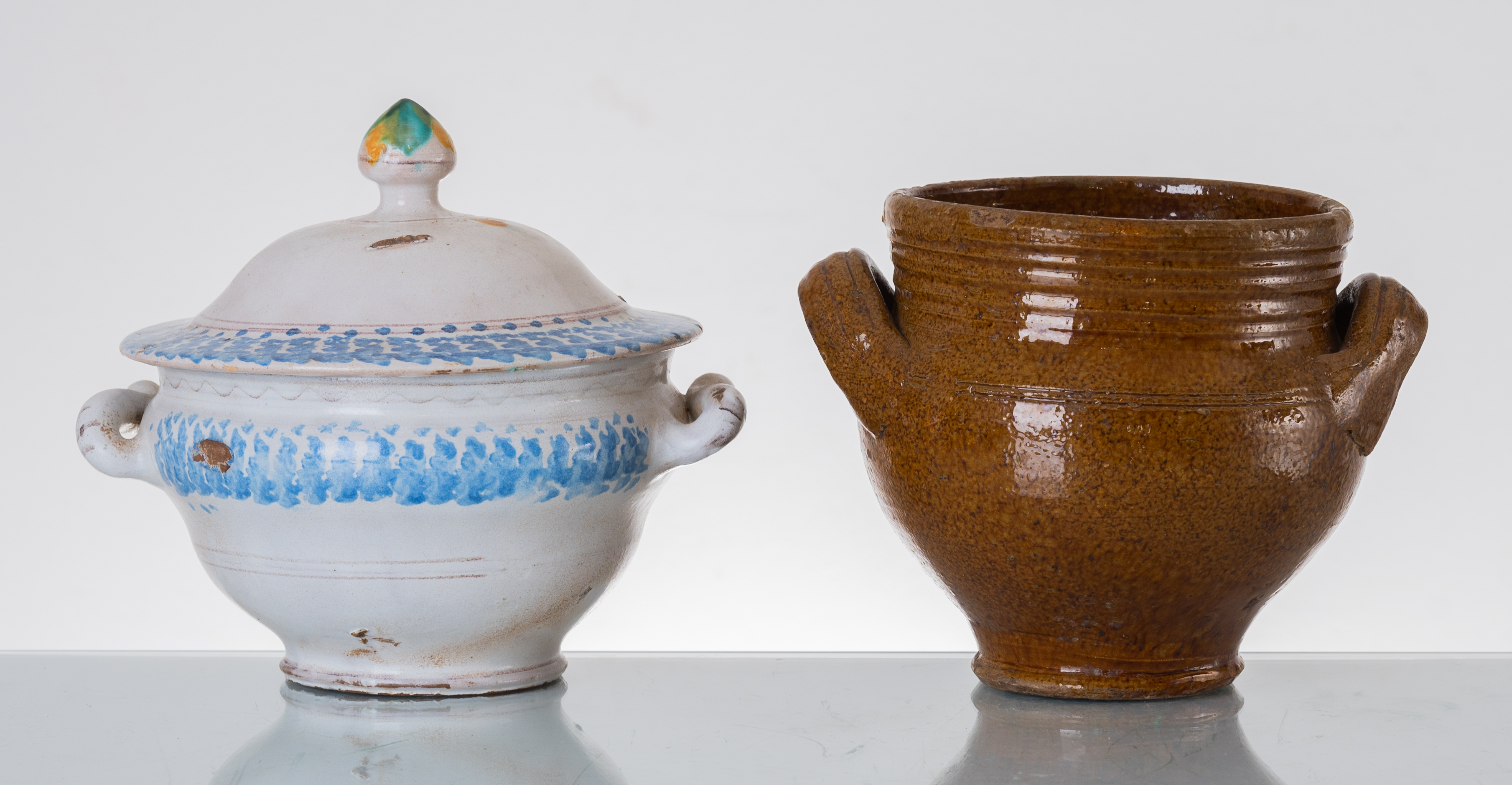 Zuppiera e contenitore porta olive con manici in ceramica smaltata (usure e filature).