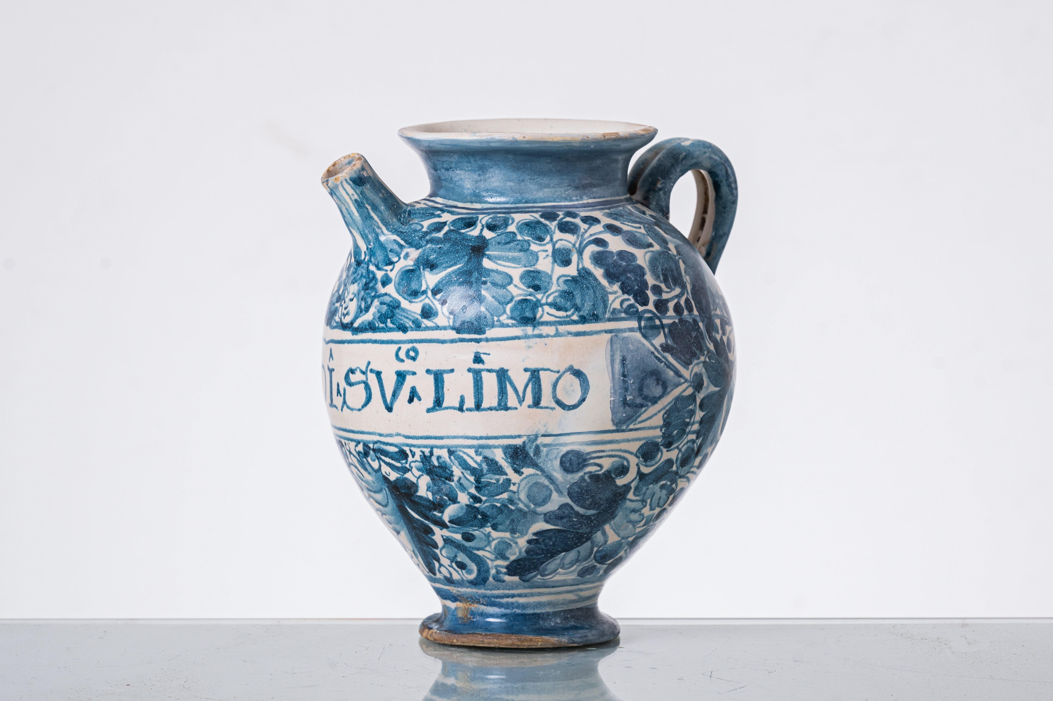 Versatoio da farmacia in ceramica smaltata e decorata a motivo fogliaceo (usure e restauri).