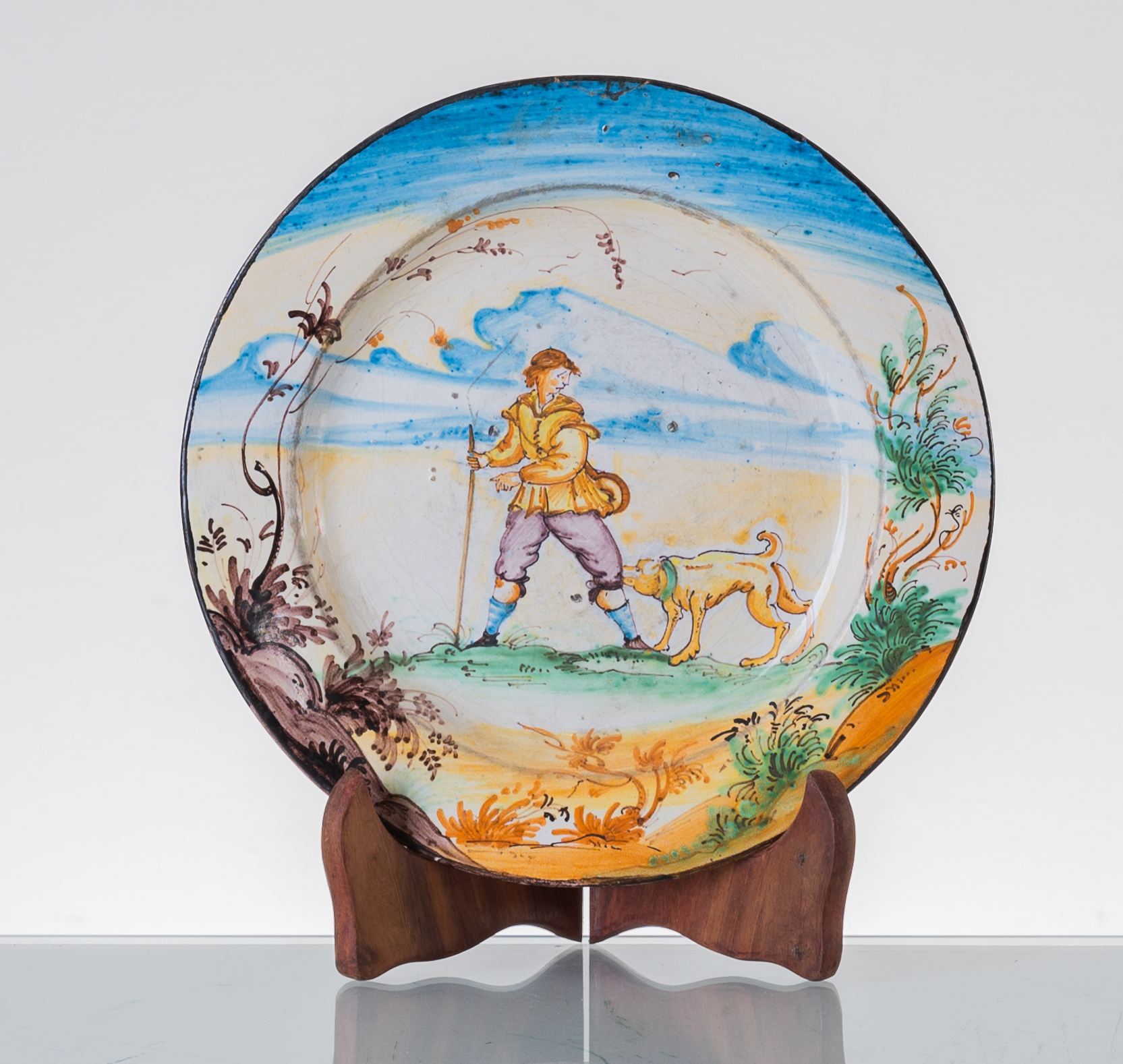 Piatto in ceramica decorata con "Contadino con cane" (usure).