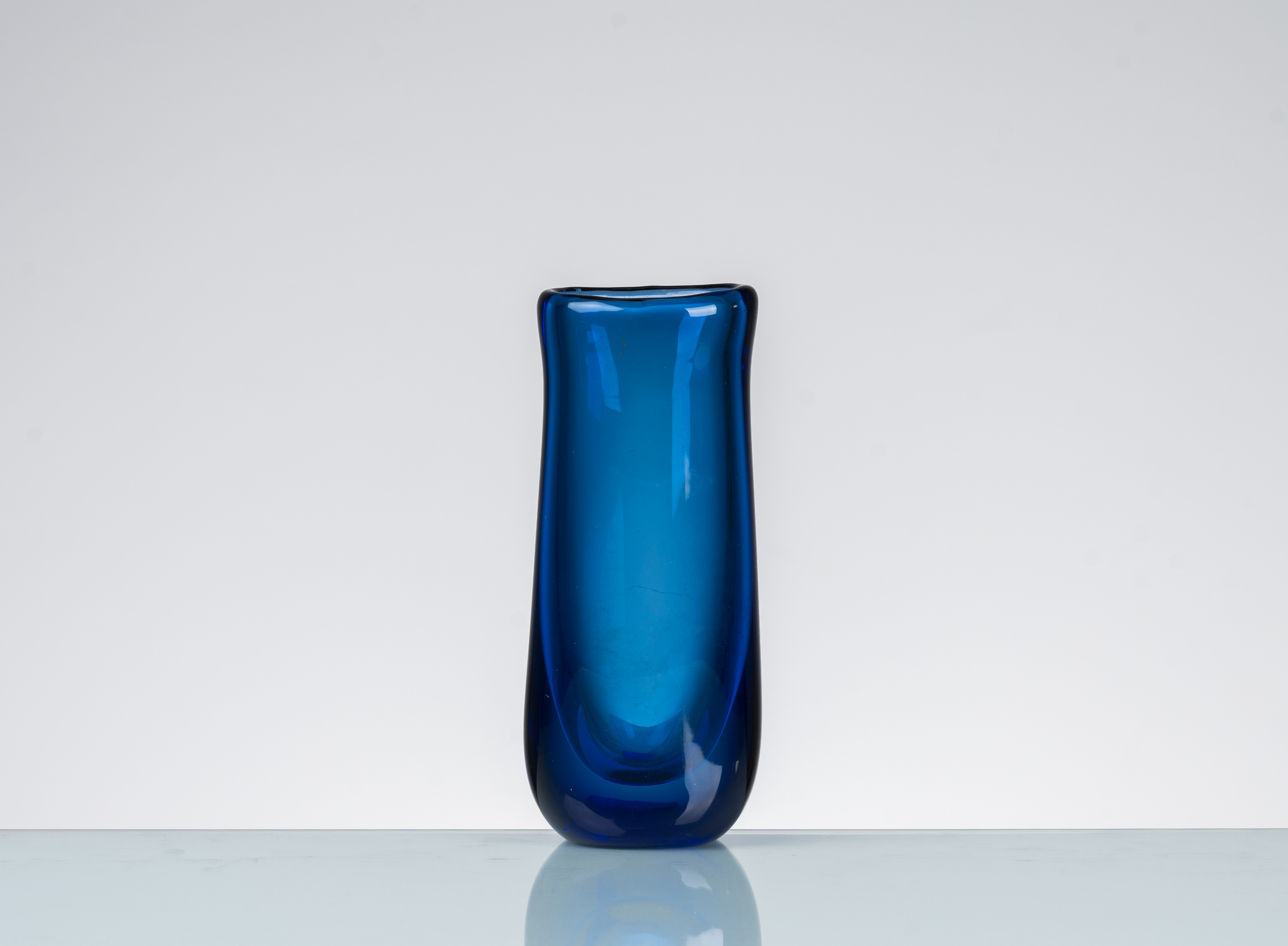 Vaso in vetro sommerso blu, corpo cilindrico schiacciato con bocca piana lievemente ondulata.
