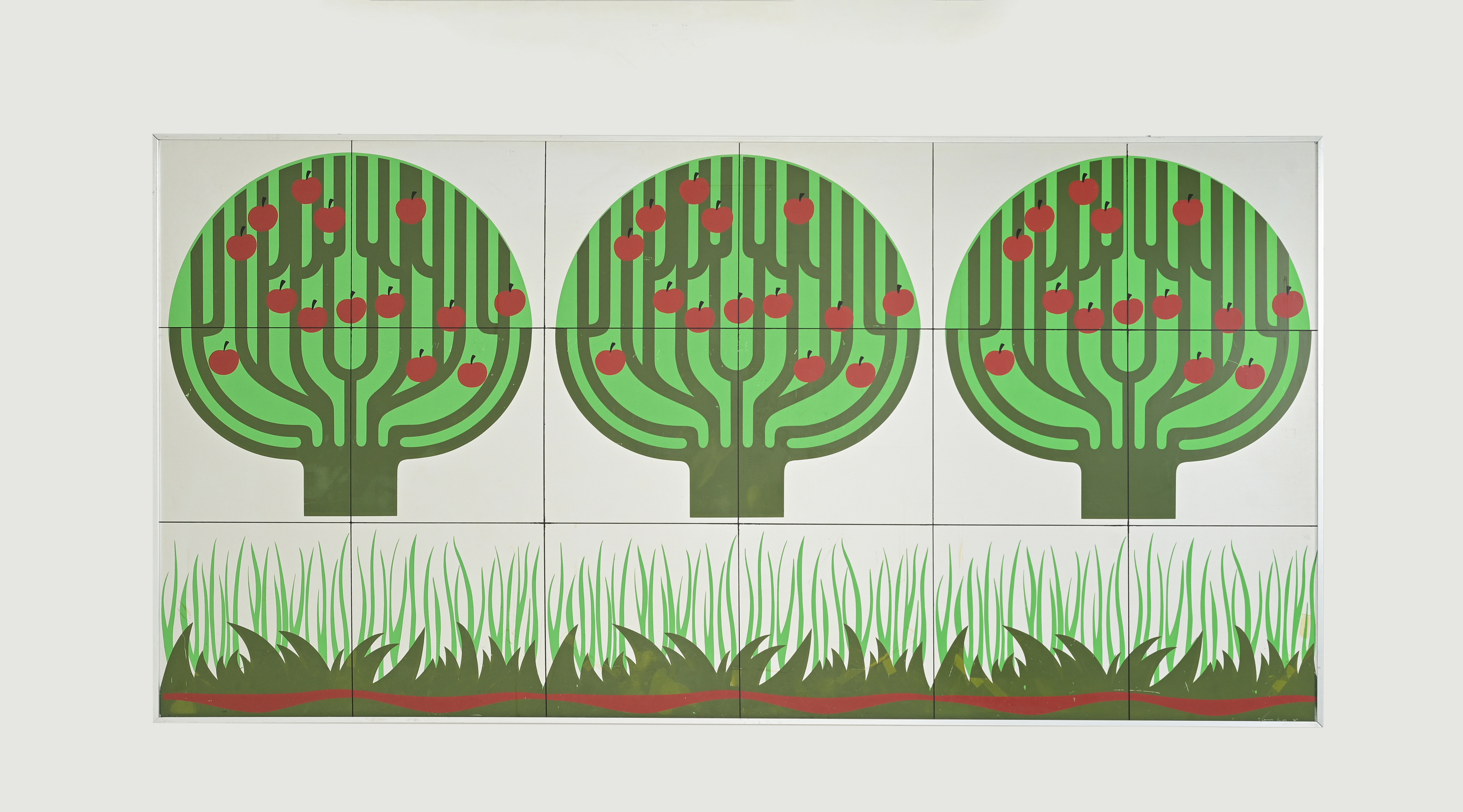 Pannello rettangolare composto da diciotto formelle in alluminio decorate con alberi da frutto, opera del 1976, firmata e numerata.