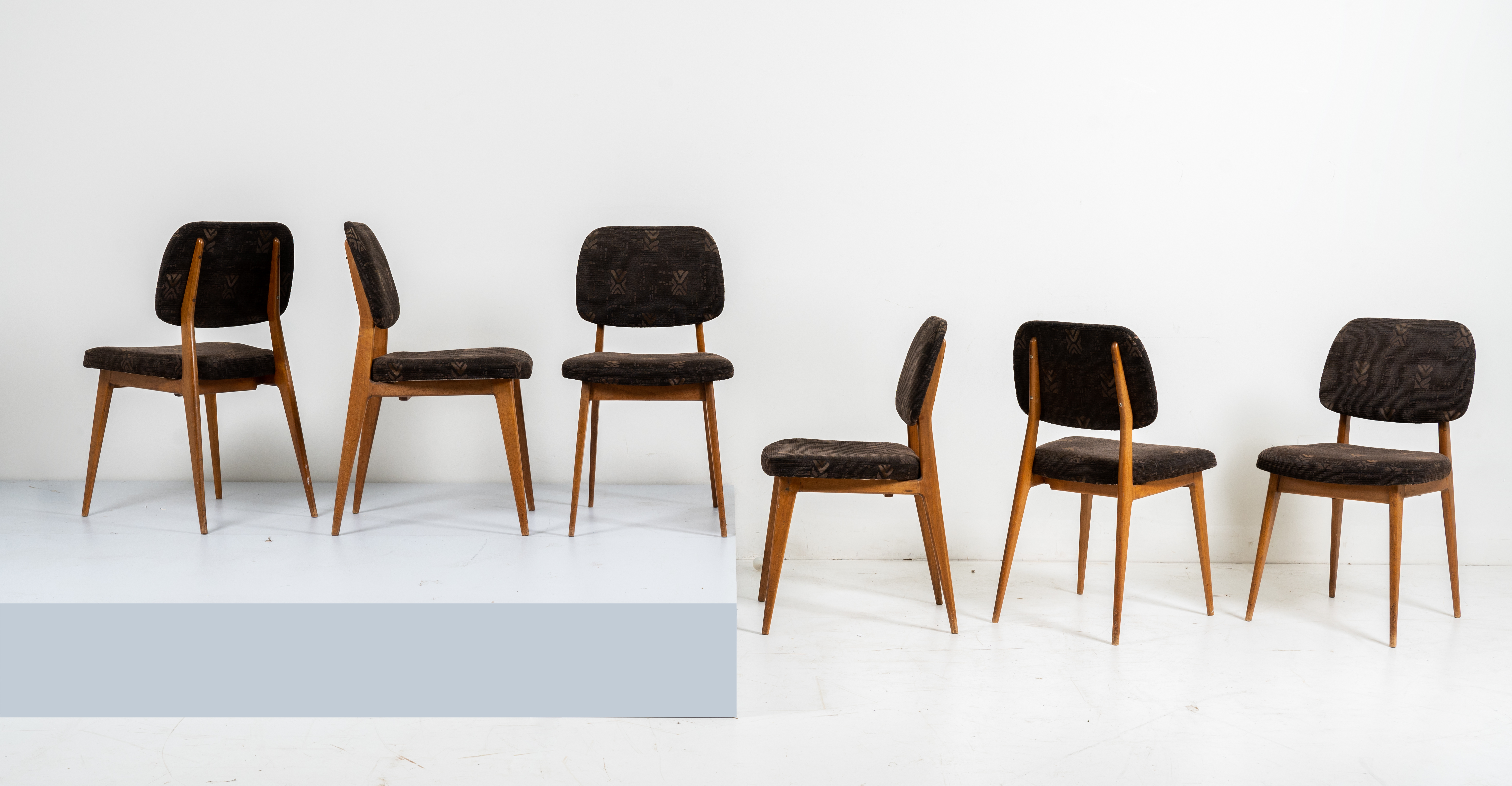 Sei sedie con struttura in legno di teak, schienale e seduta con imbottitura e rivestimento in tessuto ardesia con decori geometri. Segni di uso.