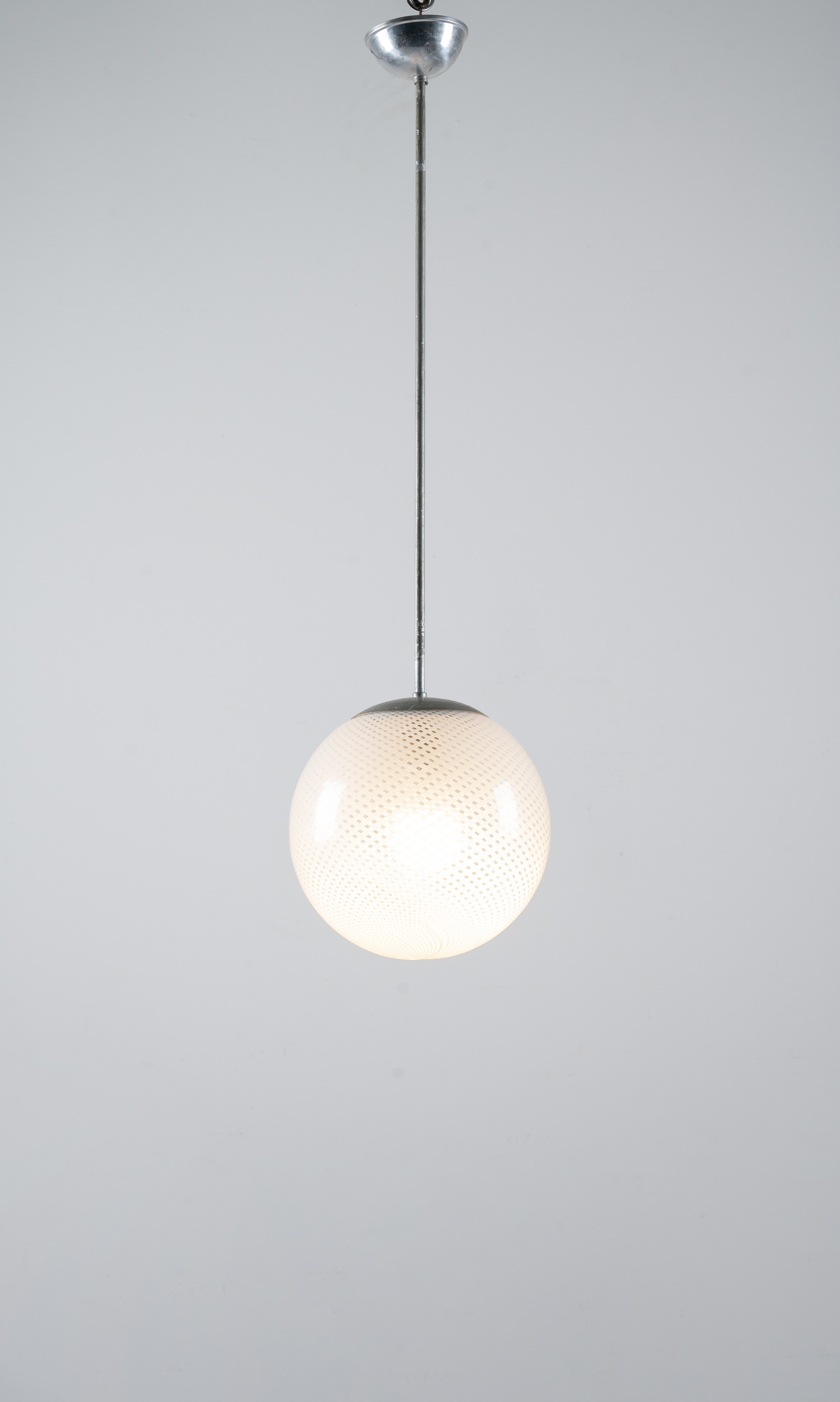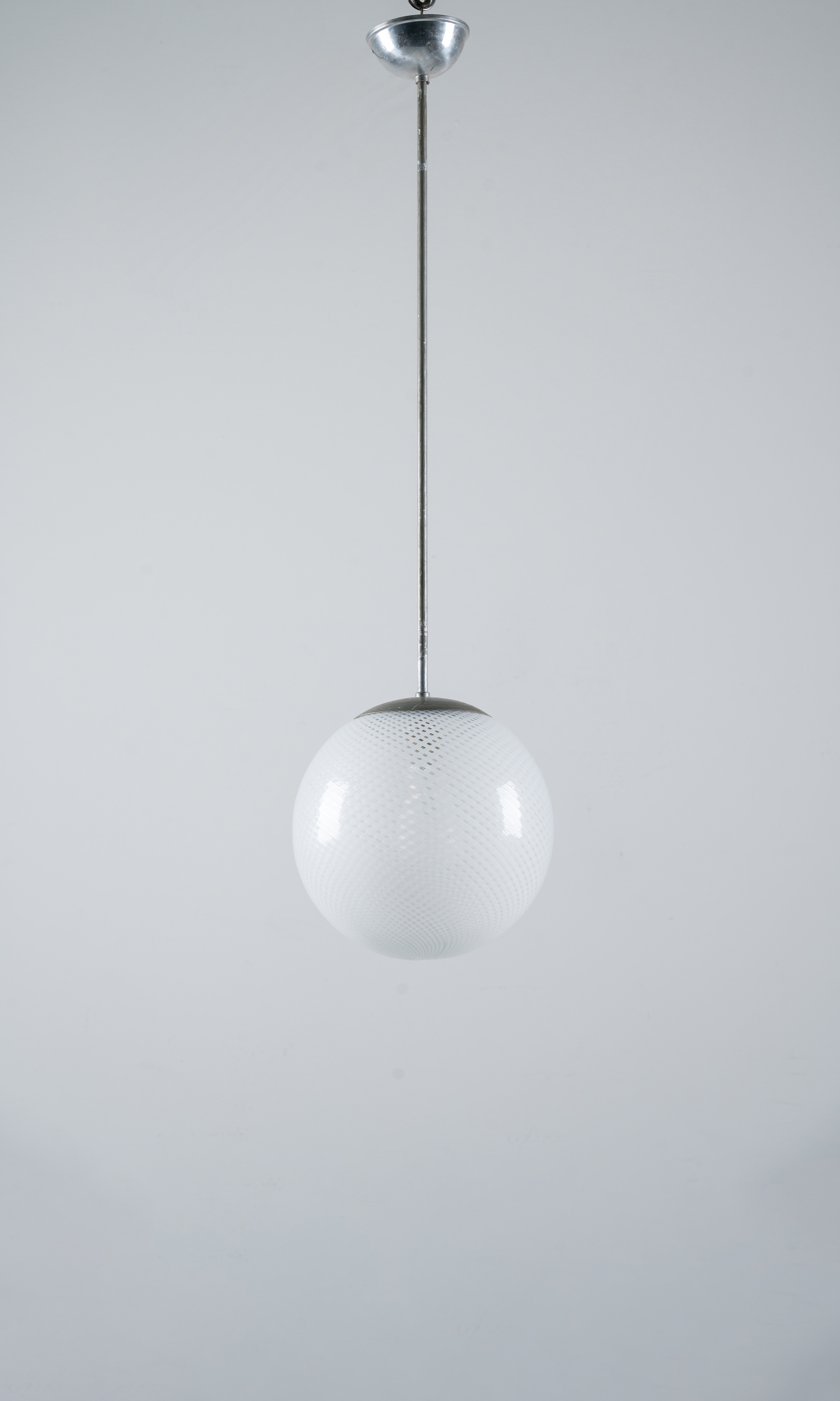 Lampada a sospensione ad una luce modello “5258”, struttura in metallo con diffusore globulare in vetro a reticello.