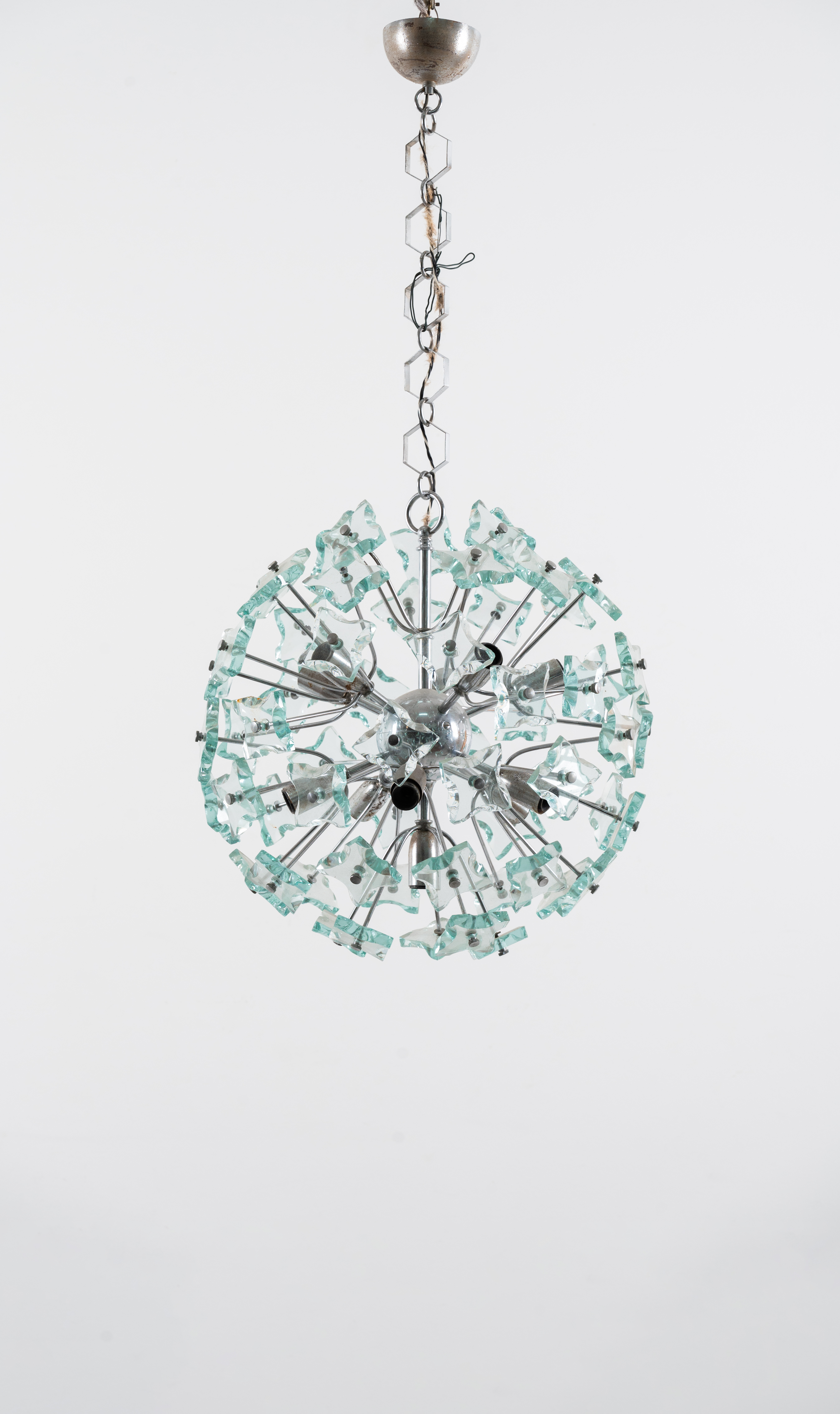 Lampada a sospensione a dieci luci, struttura in metallo cromato, diffusore sferico composto da fiori in cristalli di forte spessore parzialmente satinati e scalpellati.
