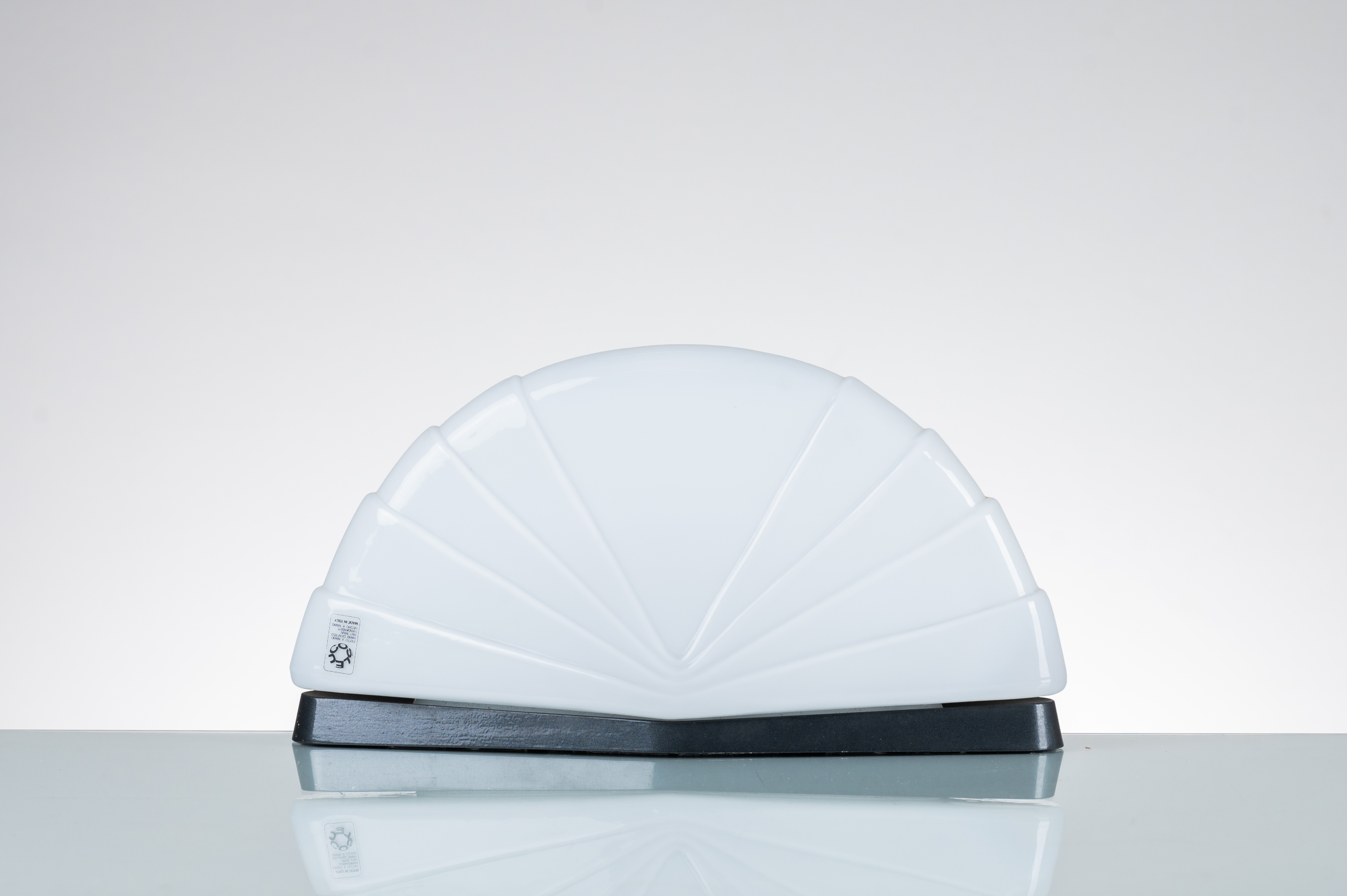 Lampada da tavolo ad una luce modello ”Flores’, struttura in alluminio pressofuso smaltato nero, diffusore a stampo in vetro opalino lattimo. Marchio di produzione.