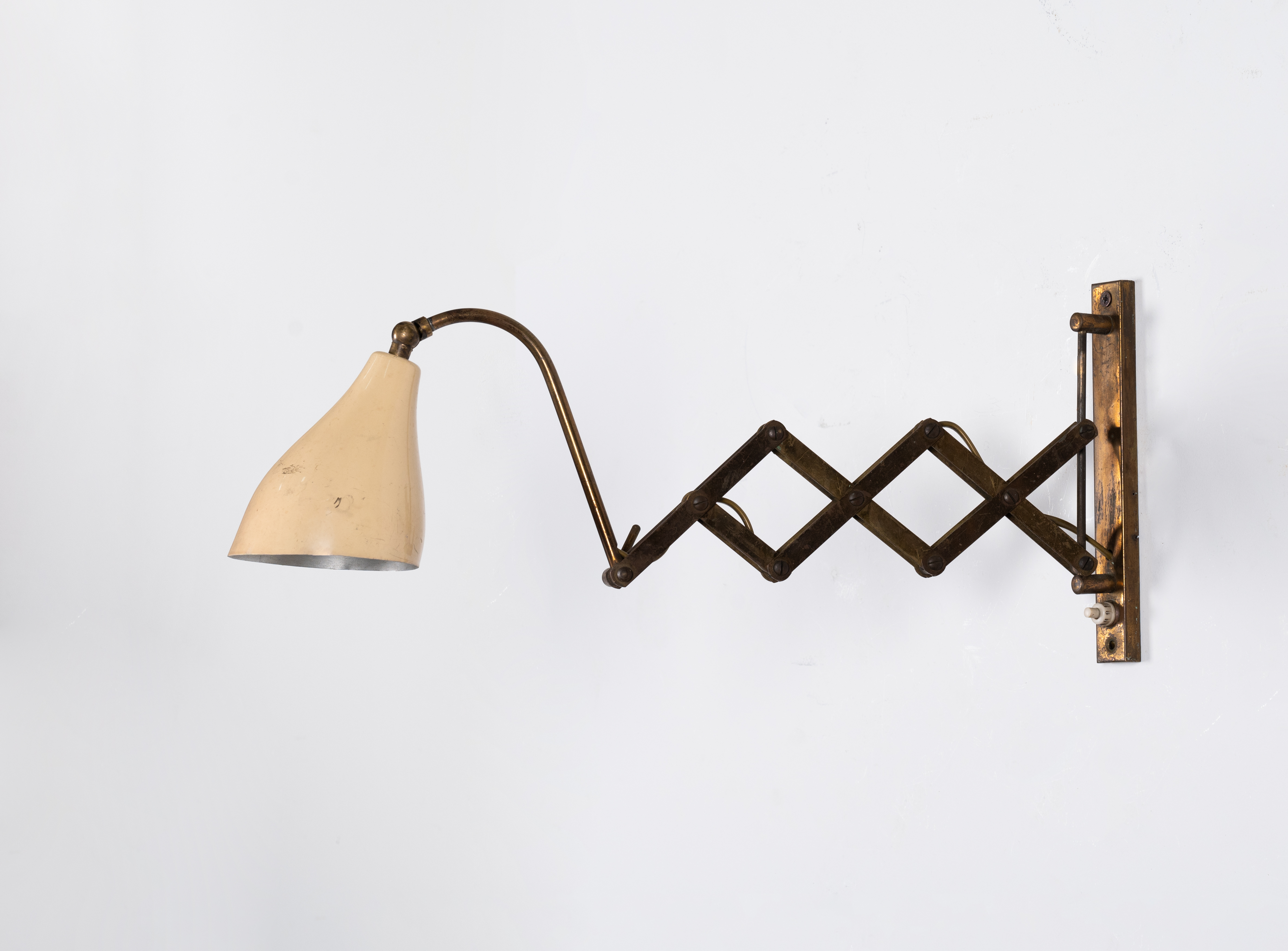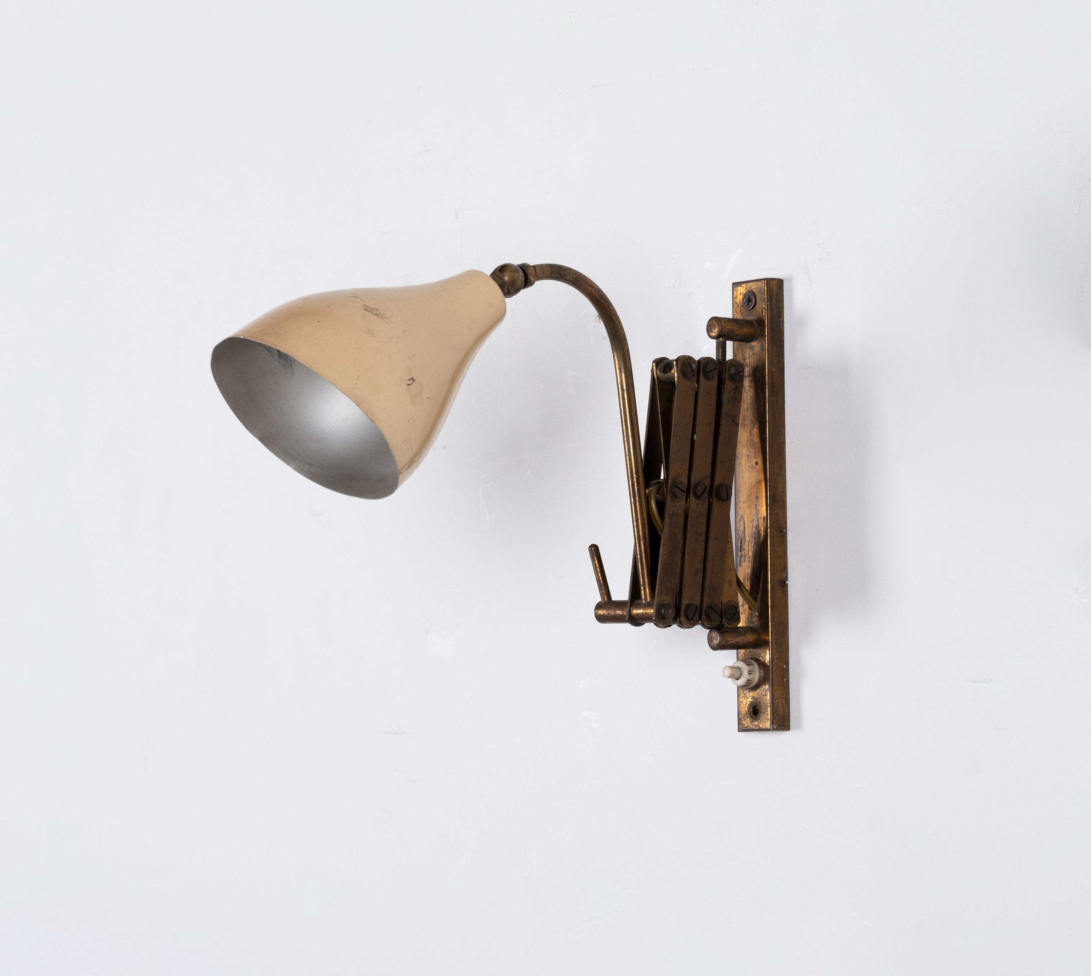 Lampada da parete ad una luce con struttura a forbice estendibile in ottone, diffusore a campana in alluminio verniciato avorio. Segni di uso e lievi difetti.