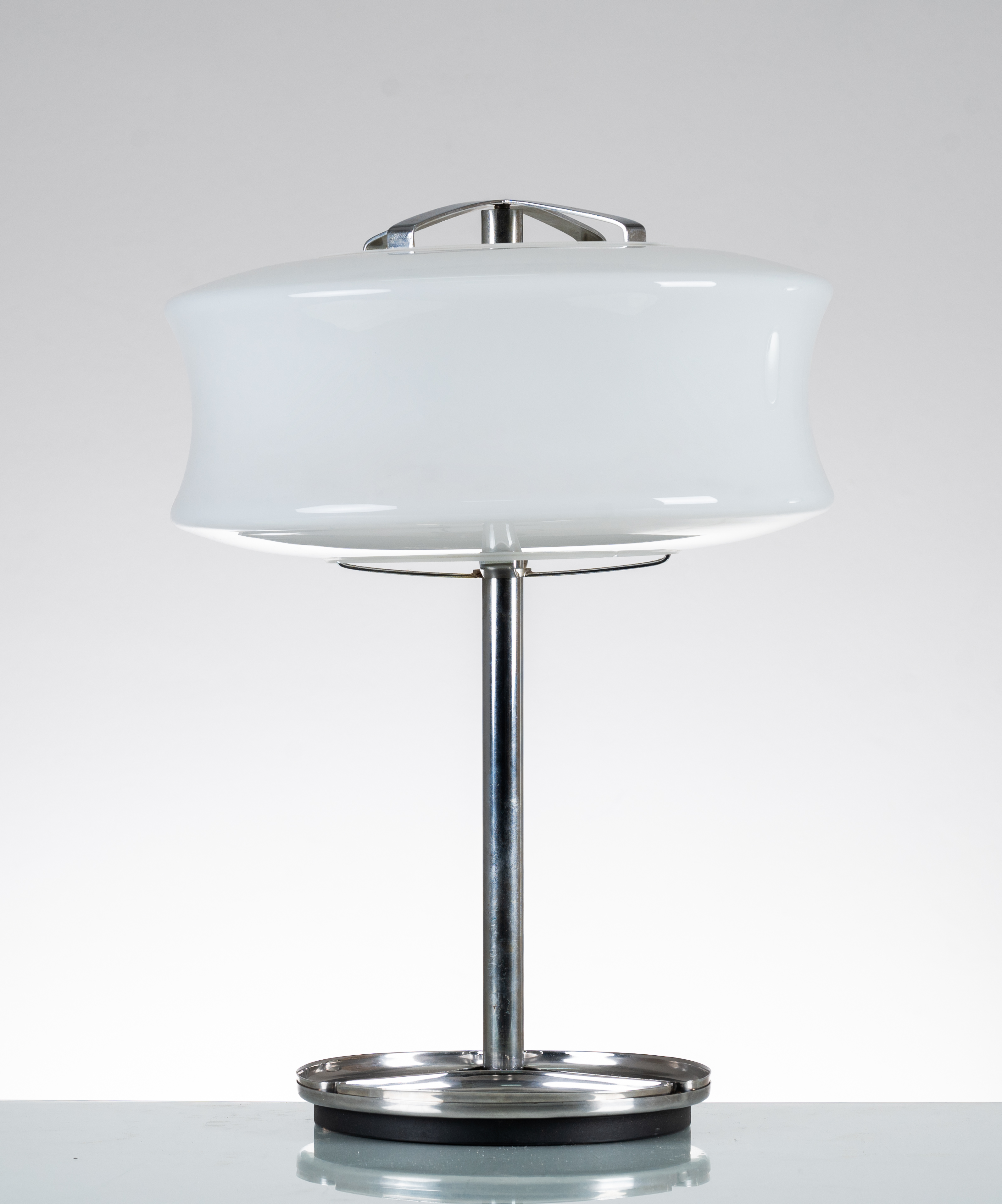 Lampada da tavolo a due luci, struttura in metallo cromato con diffusore a disco circolare in vetro lattimo.