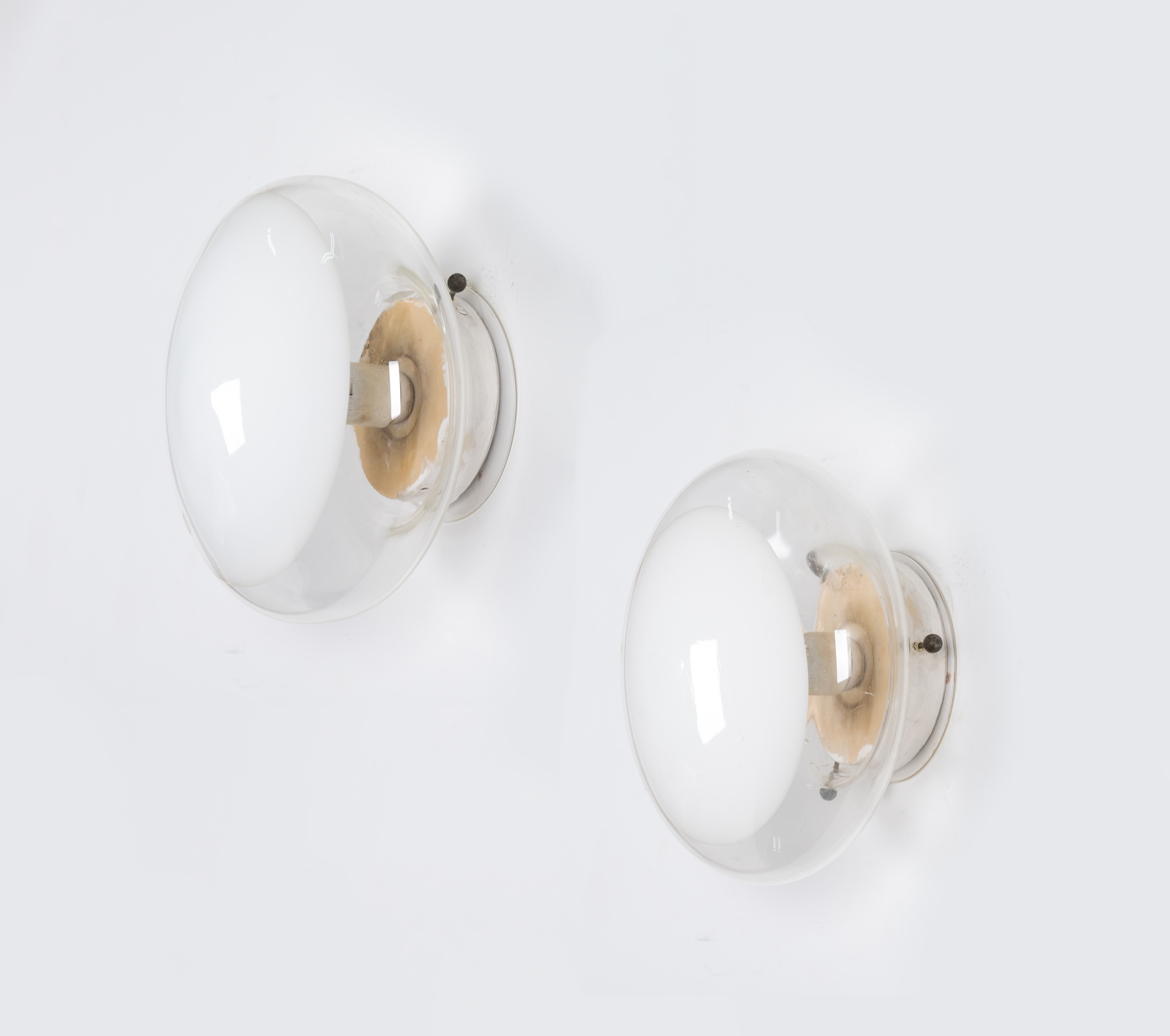 Due lampade da parete o da soffitto ad una luce modello “Gill 28”, struttura in metallo verniciato bianco, diffusore circolare in cristallo con registro opalino.