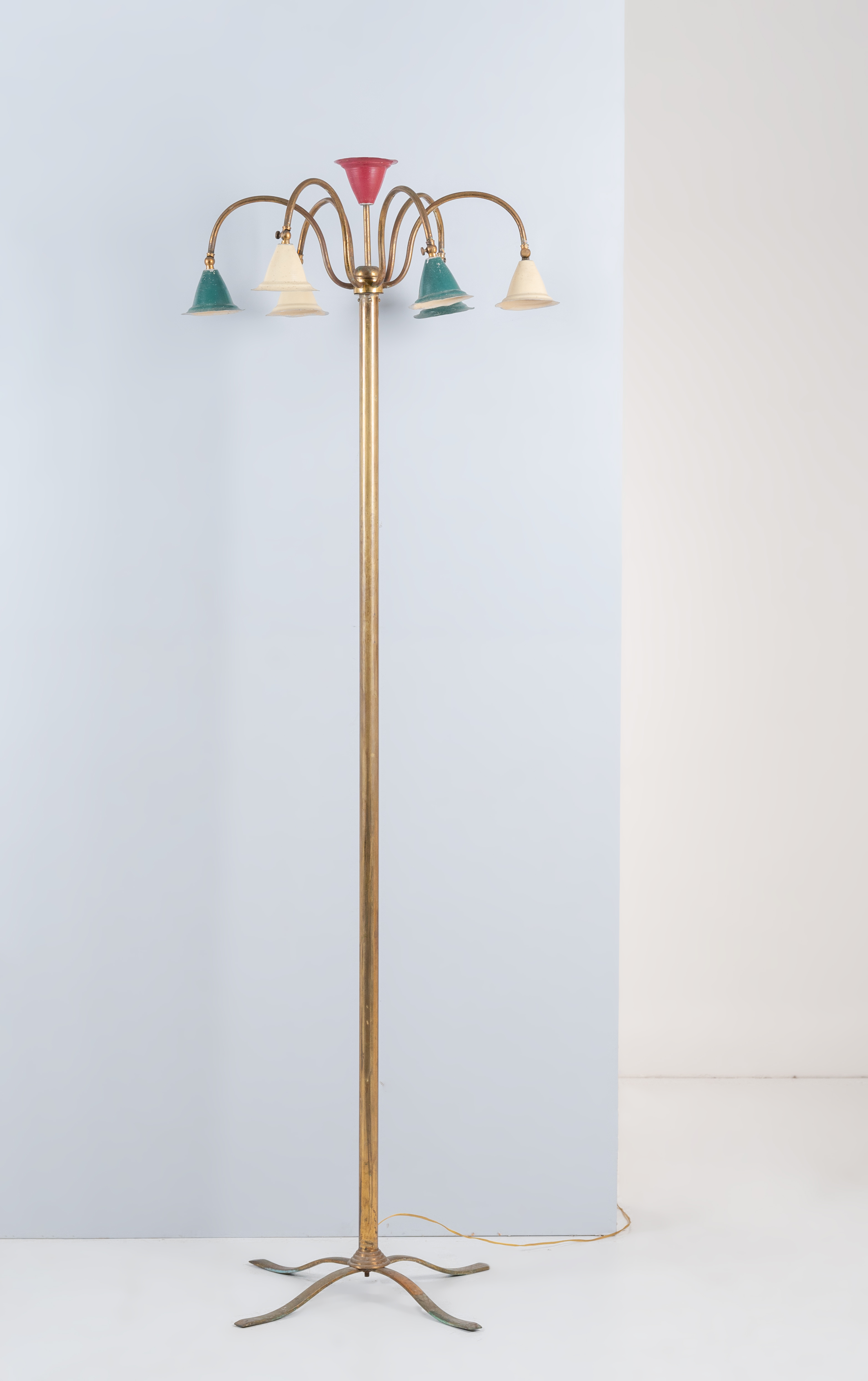 Lampada da terra a sei luci, struttura in ottone, diffusori orientabili in alluminio verniciato avorio, verde e rosso, piede tripode. Segni di uso e difetti.