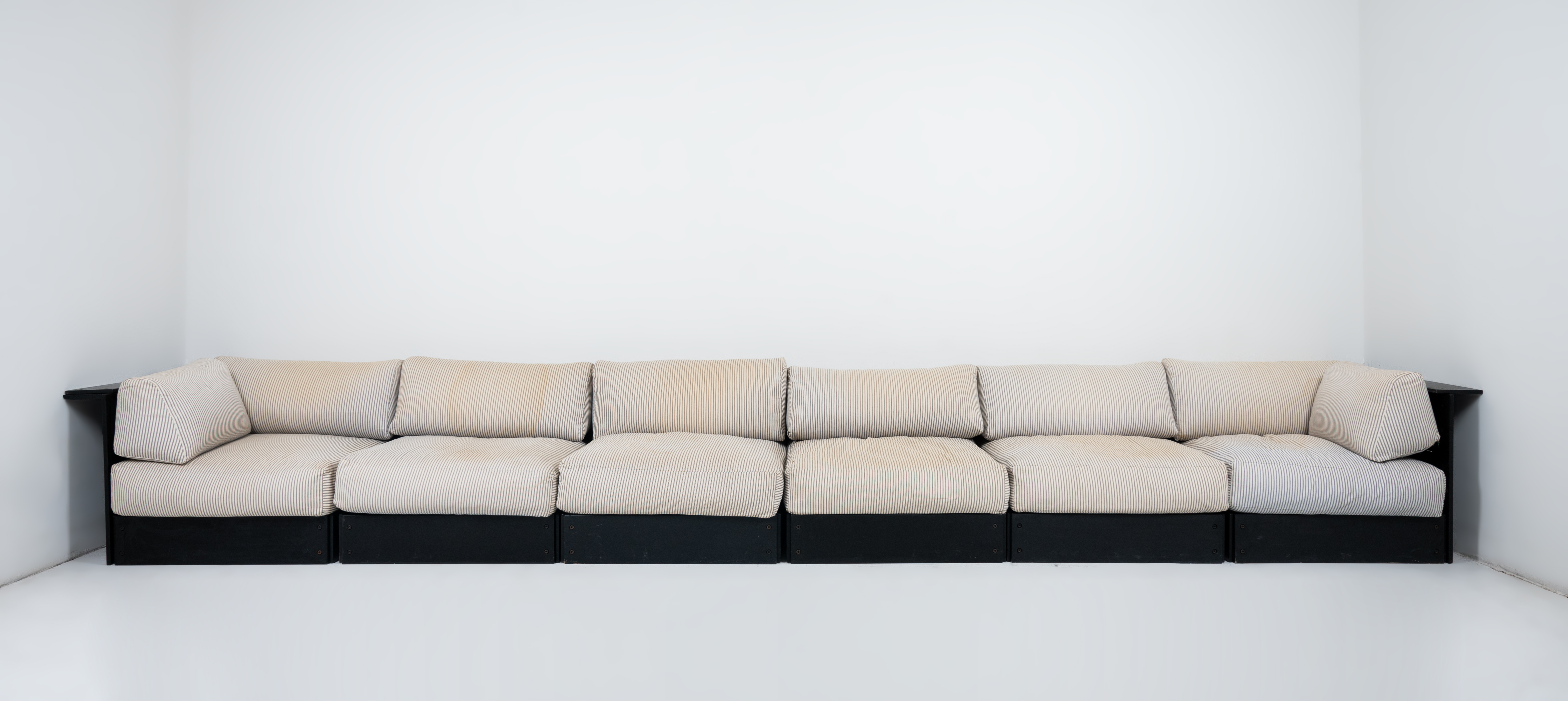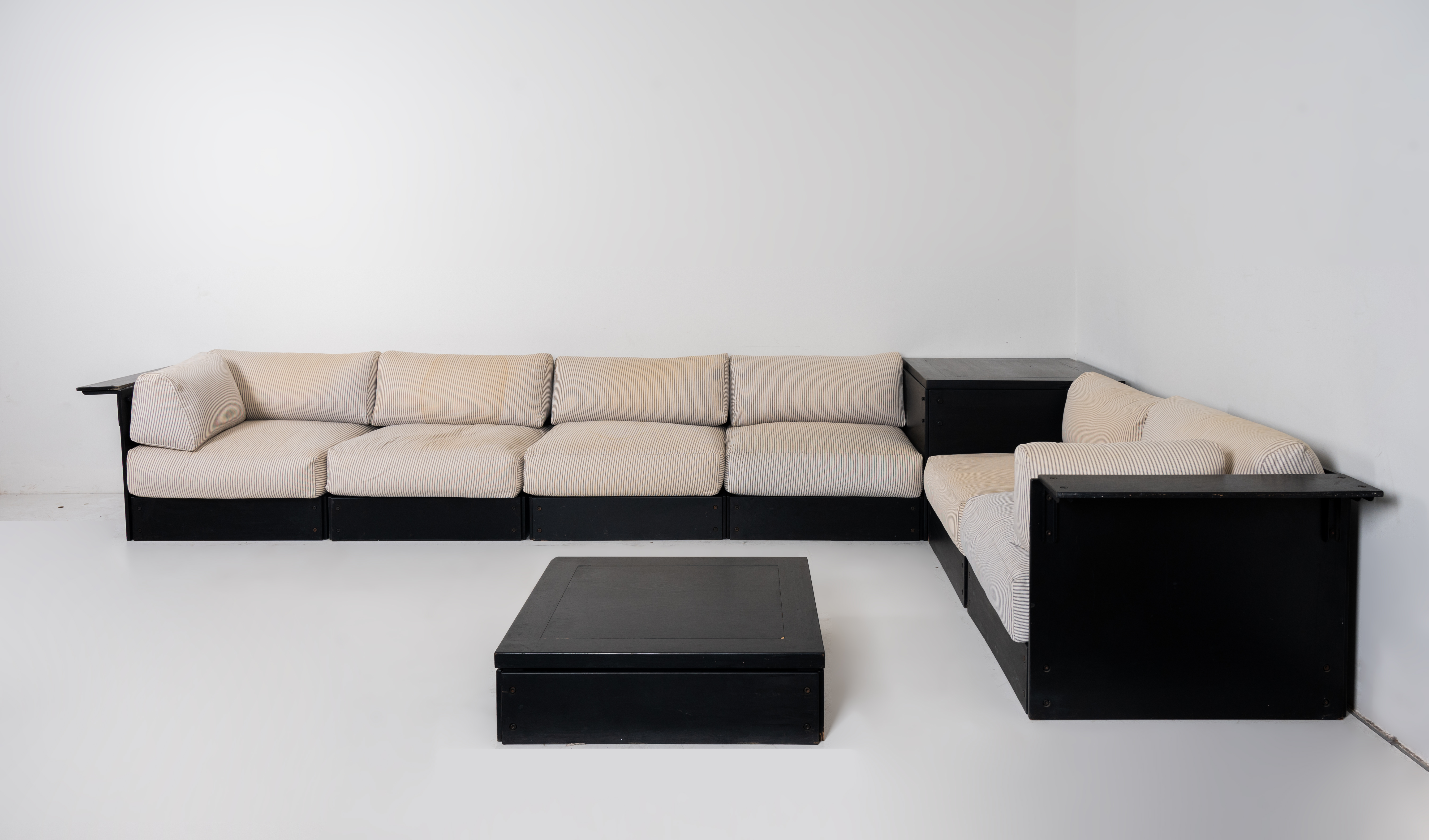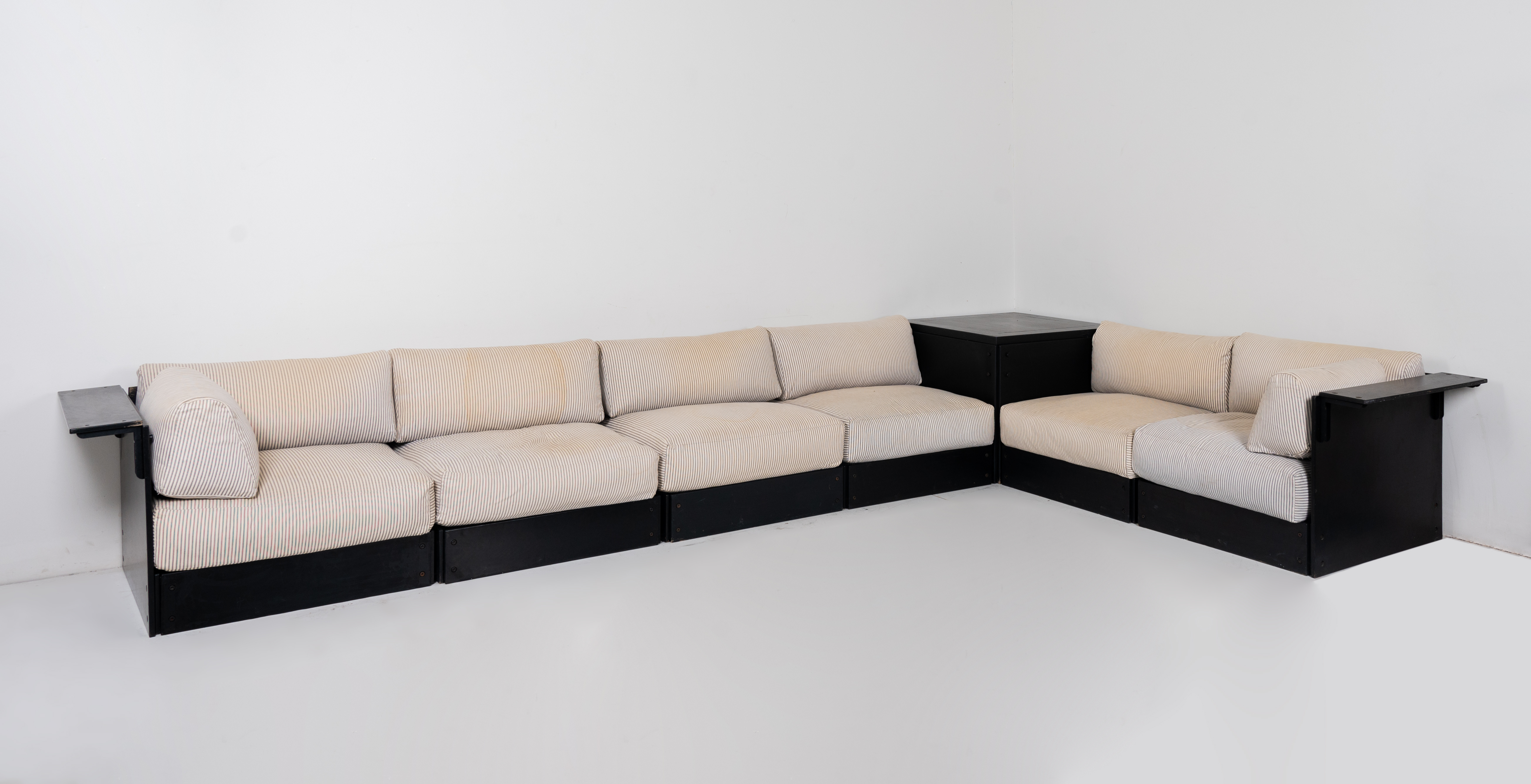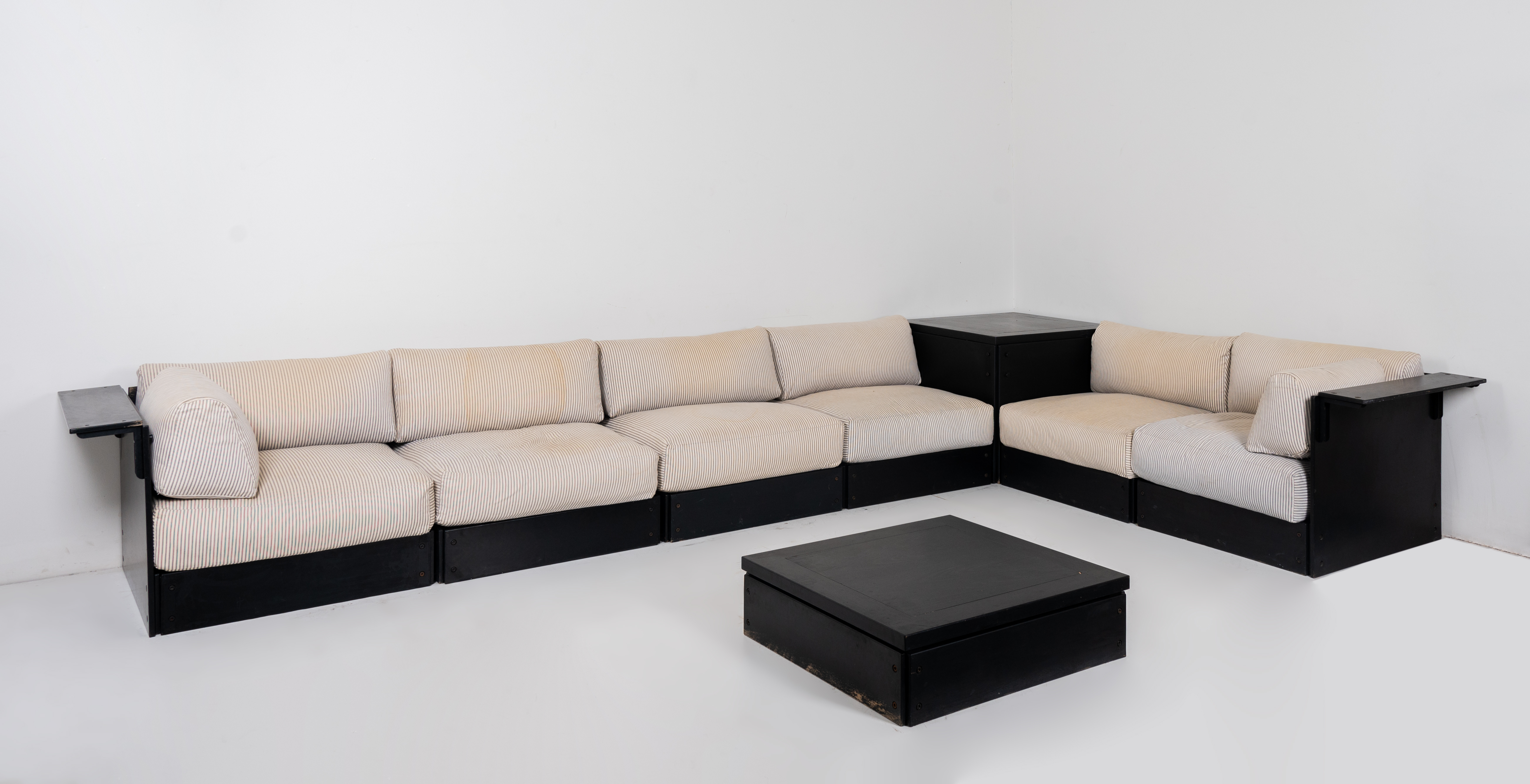 Divano modulare a sei posti con angolo appoggio e tavolo basso, struttura in legno di faggio verniciato nero, cuscini di seduta e spalliera con imbottitura e rivestimento in tessuto avorio e righe grigie. Lievi difetti e macchie. Illustrazione allegata del modello.