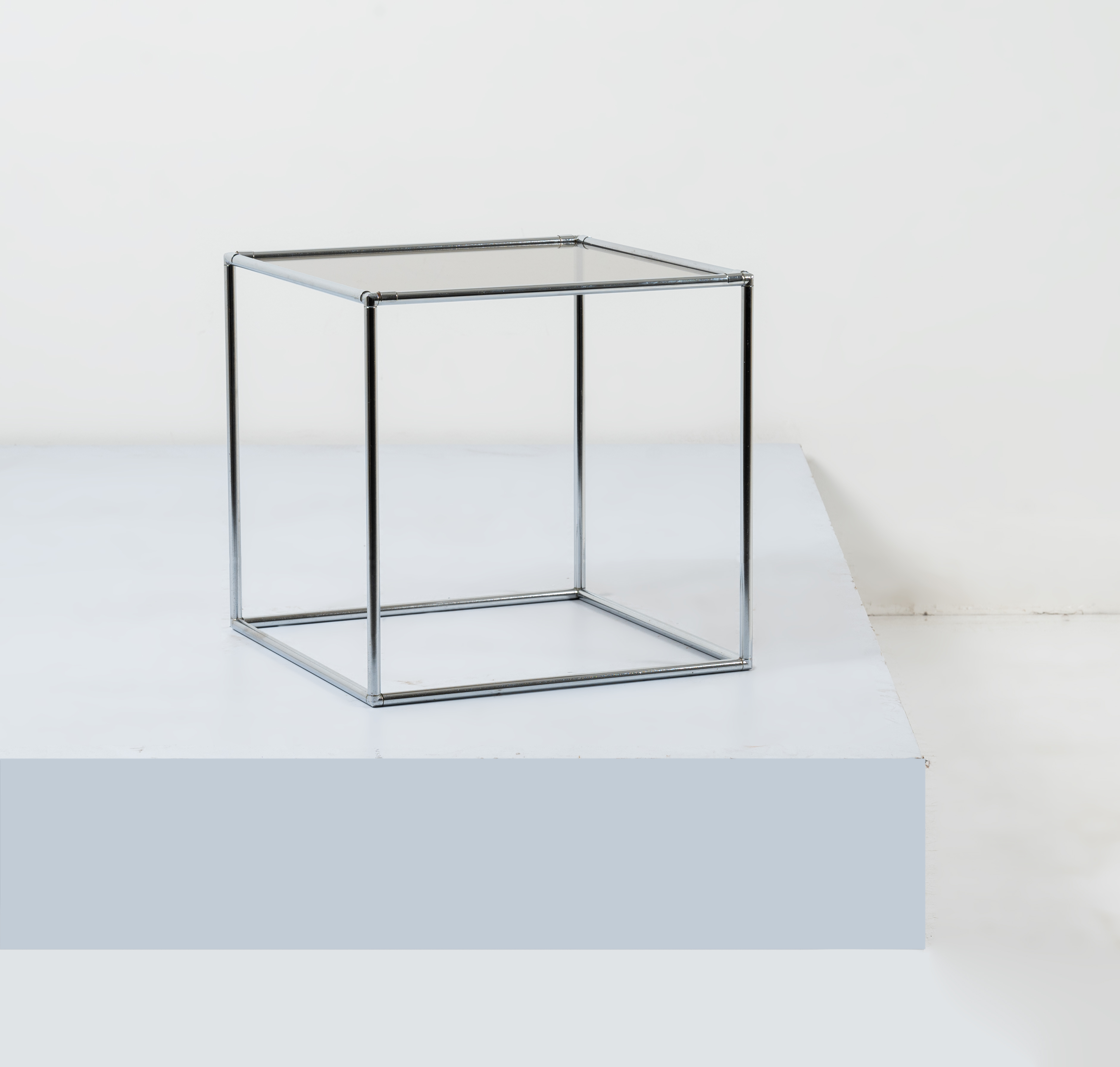 Tavolo occasionale con struttura in metallo, piano quadrato in vetro trasparente.