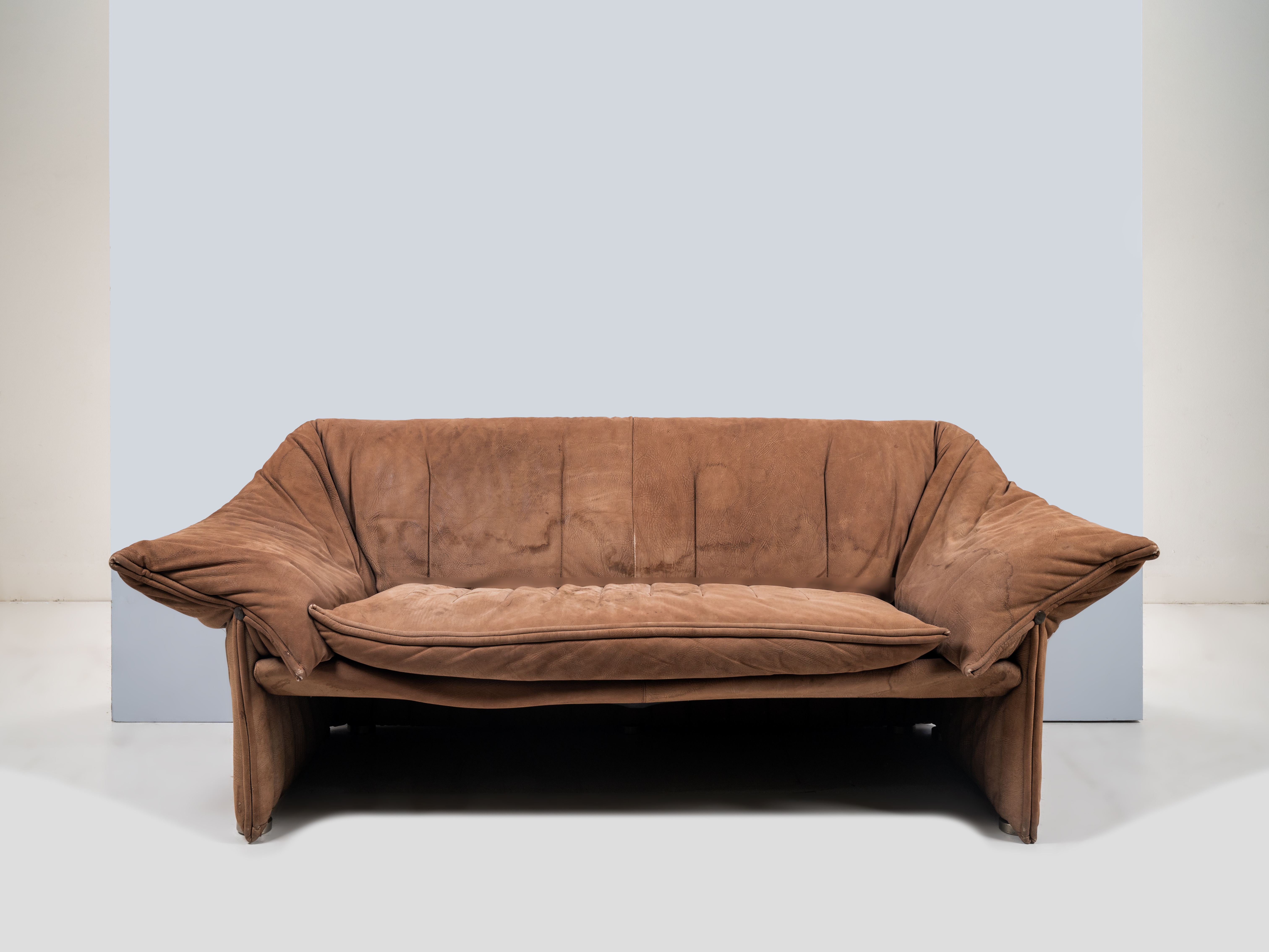 Divano a due posti modello “Le Stelle” struttura in metallo, rivestimento in poliuretano rivestito in pelle marrone, marchio del produttore sul bottone ferma tessuto. Etichetta di produzione. Segni di uso e macchie.