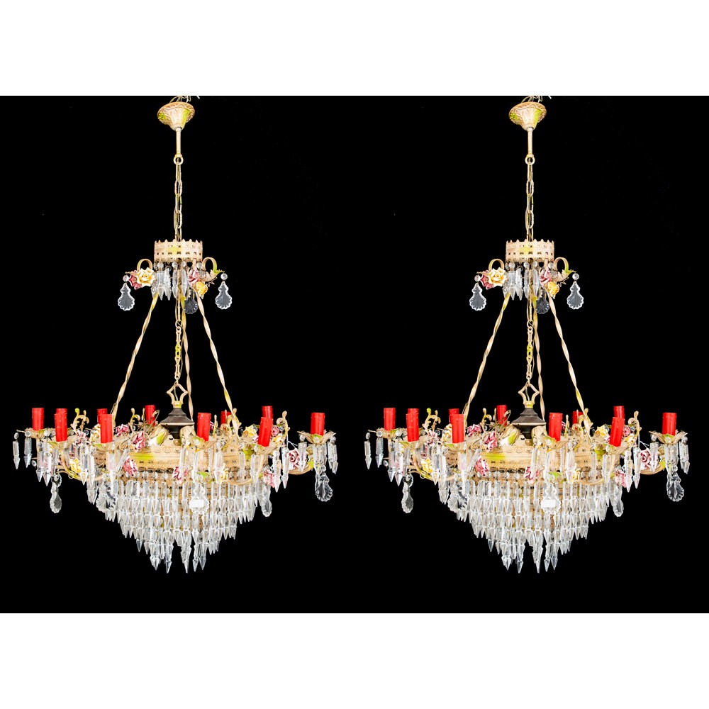 COPPIA LAMPADARI a quattordici luci in ferro laccato con pendenti e piccole rose in porcellana.
