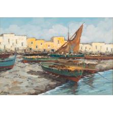 RAFFAELE CAIAZZO, Paesaggio con barche a secco, Olio su tela